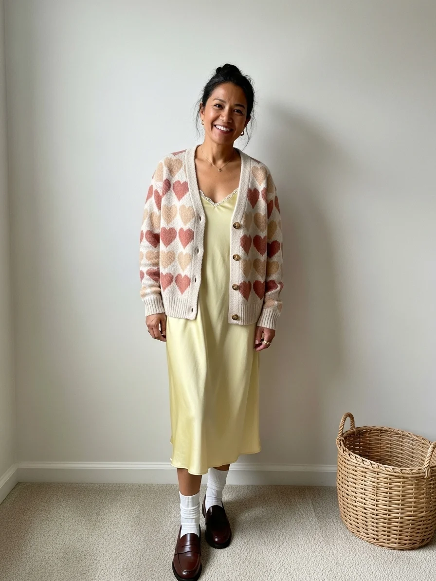 Heart-patterned cardigan over slip dress with ankle socks and loafers