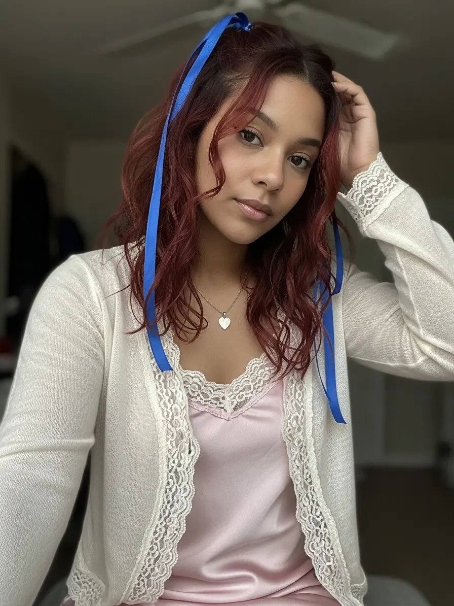 A ribbon-tied crop top adds a contemporary touch while maintaining the coquette aesthetic.