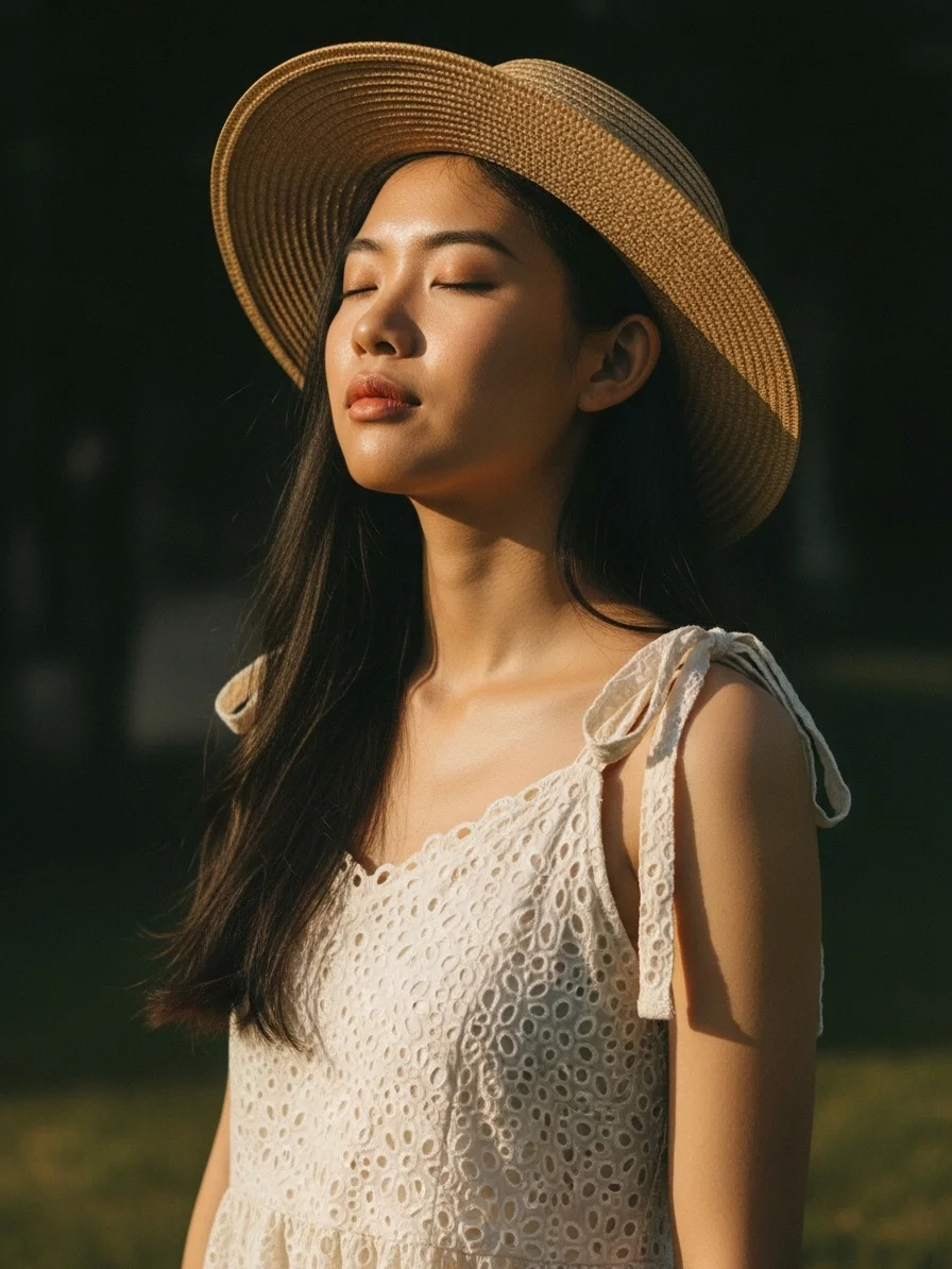 Perfect for summer, this outfit exudes romantic charm. The eyelet lace sundress is light and airy, ideal for warm days.