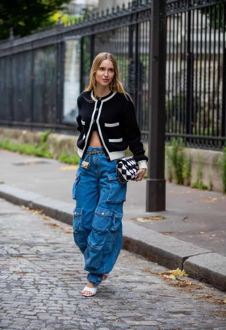 Embrace the perfect blend of cozy and chic with this eye-catching autumn ensemble. The cropped black and white cardigan adds a touch of sophistication while keeping you warm on crisp fall days. Paired with oversized cargo jeans, this outfit seamlessly combines comfort and style. The baggy denim silhouette offers a relaxed vibe, ideal for casual outings or running errands. Accessorize with a statement checkered clutch and minimalist white sandals to elevate the look. This outfit demonstrates how to rock the baggy trend while maintaining a polished appearance, making it a must-have for your fall wardrobe refresh.