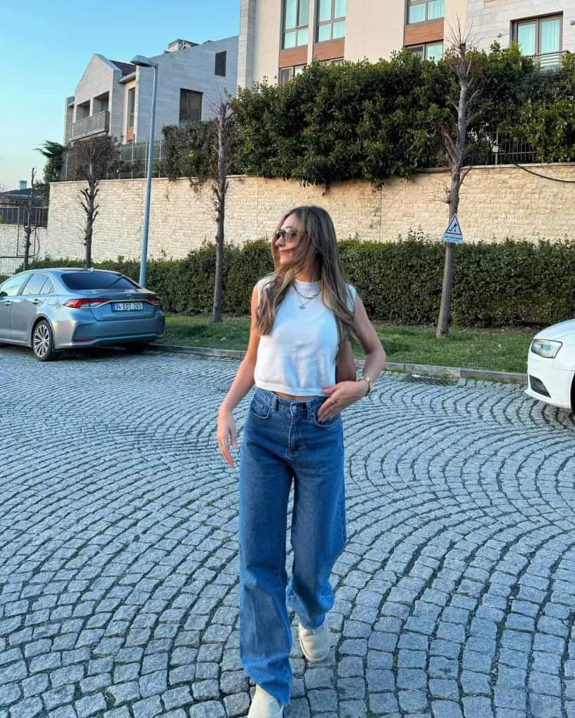 While not a typical fall outfit, this ensemble showcases how to transition your summer favorites into cooler weather. The high-waisted, wide-leg jeans offer a relaxed, baggy silhouette that’s perfect for layering as temperatures drop. Paired with a simple white crop top, this look creates a balanced contrast between fitted and loose elements. To make it autumn-appropriate, simply add a chunky cardigan or oversized blazer. The versatility of these statement jeans allows for endless styling options, making them a must-have for your fall wardrobe. Their relaxed fit embodies the cozy essence of the season while maintaining a chic, modern edge.