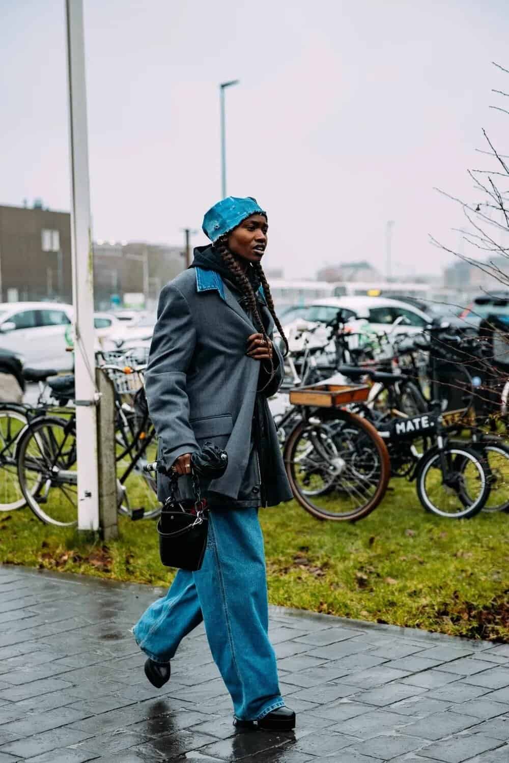 Elevate your autumn wardrobe with this chic and cozy ensemble that perfectly embodies the baggy fall outfit trend. The oversized charcoal coat adds a touch of sophistication while providing ample warmth for those crisp autumn days. Paired with relaxed-fit light blue jeans, this outfit strikes the ideal balance between comfort and style. The vibrant teal beanie adds a pop of color, complementing the denim and tying the look together. Accessorized with a small black handbag and chunky shoes, this outfit is both practical and fashionable for navigating city streets or running errands. The layered approach allows for easy adaptation to changing temperatures, making it a versatile choice for unpredictable fall weather.