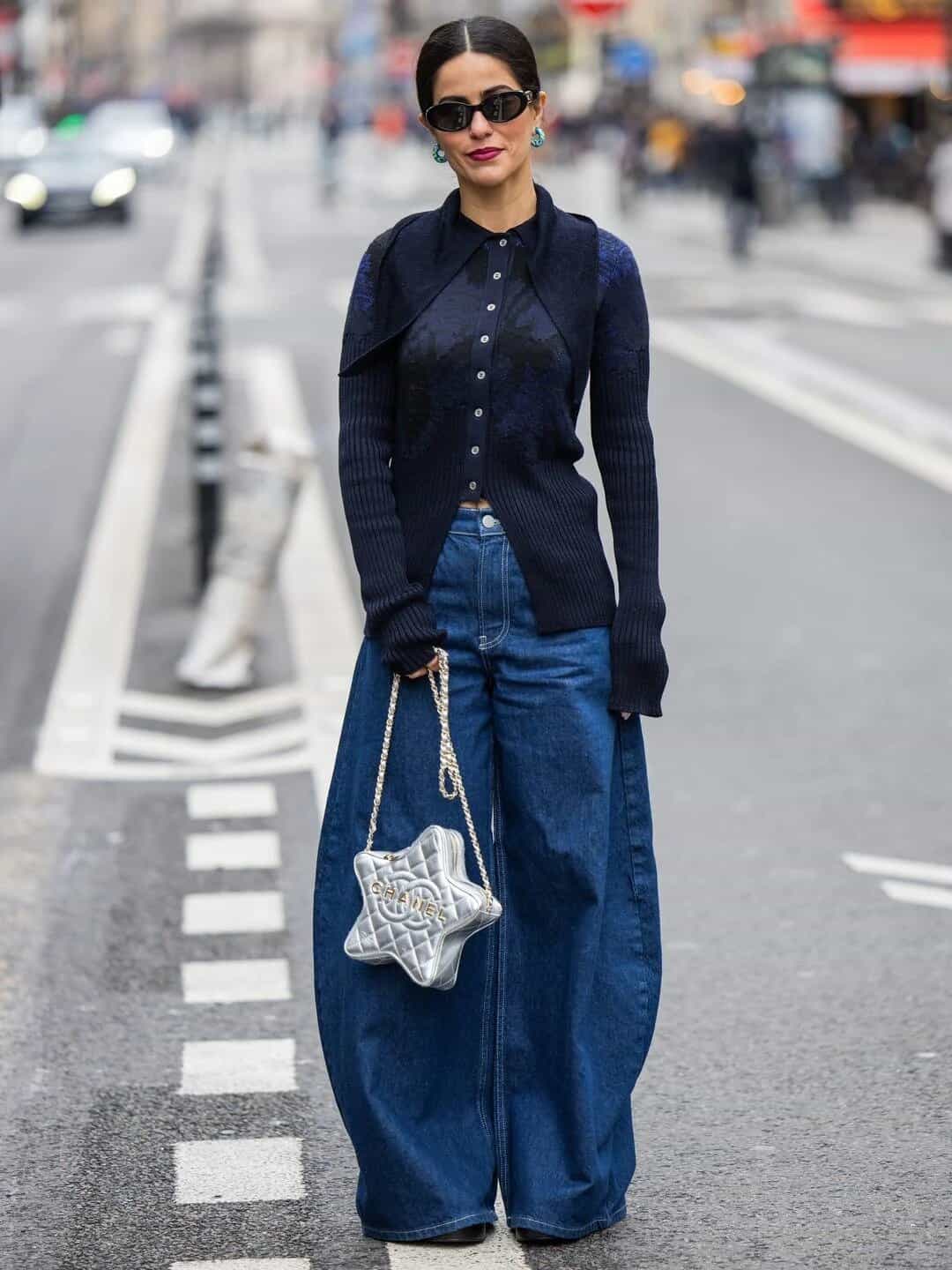 Elevate your autumn wardrobe with this sophisticated take on baggy fall fashion. The outfit seamlessly blends cozy comfort with urban chic, featuring an oversized navy cardigan layered over a matching button-down shirt. The star of this ensemble is undoubtedly the ultra-wide leg denim jeans, offering a dramatic silhouette that’s both on-trend and supremely comfortable. Accessorized with sleek sunglasses, statement earrings, and a unique metallic star-shaped handbag, this look proves that baggy can be incredibly stylish. The monochromatic navy top paired with classic denim creates a versatile, put-together appearance perfect for crisp autumn days in the city.