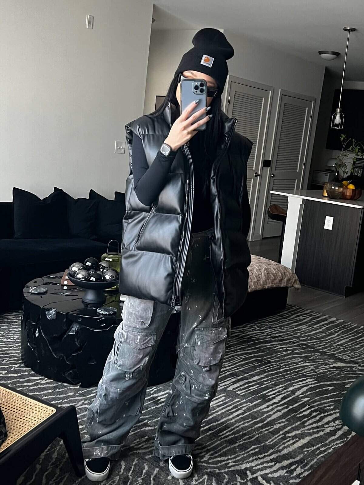 Embrace the perfect blend of cozy and chic with this standout autumn ensemble. The glossy black puffer vest adds a touch of urban sophistication while providing essential warmth for crisp fall days. Paired with relaxed-fit cargo pants in a distressed gray finish, this outfit strikes an ideal balance between comfort and style. The look is completed with a classic black beanie and sneakers, creating a cohesive monochromatic palette that’s both edgy and effortlessly cool. This combination showcases how baggy fall fashion can be elevated to create a sleek, fashion-forward look that’s perfect for casual outings or laid-back weekends.