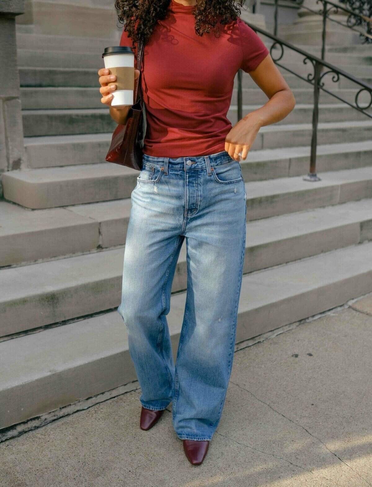 Embrace the perfect blend of comfort and style with this retro-inspired autumn look. The outfit features a pair of relaxed, wide-leg jeans that offer a roomy, baggy silhouette while maintaining a chic appearance. Paired with a fitted rust-colored top, this ensemble creates a balanced and flattering shape. The warm hue of the top complements the cool tones of the denim, making it an ideal choice for fall. Accessorized with burgundy shoes and a matching handbag, this outfit demonstrates how baggy can be both cozy and fashionable. It’s a versatile look that can easily transition from casual daytime activities to evening outings, proving that comfort doesn’t have to compromise style in your autumn wardrobe.