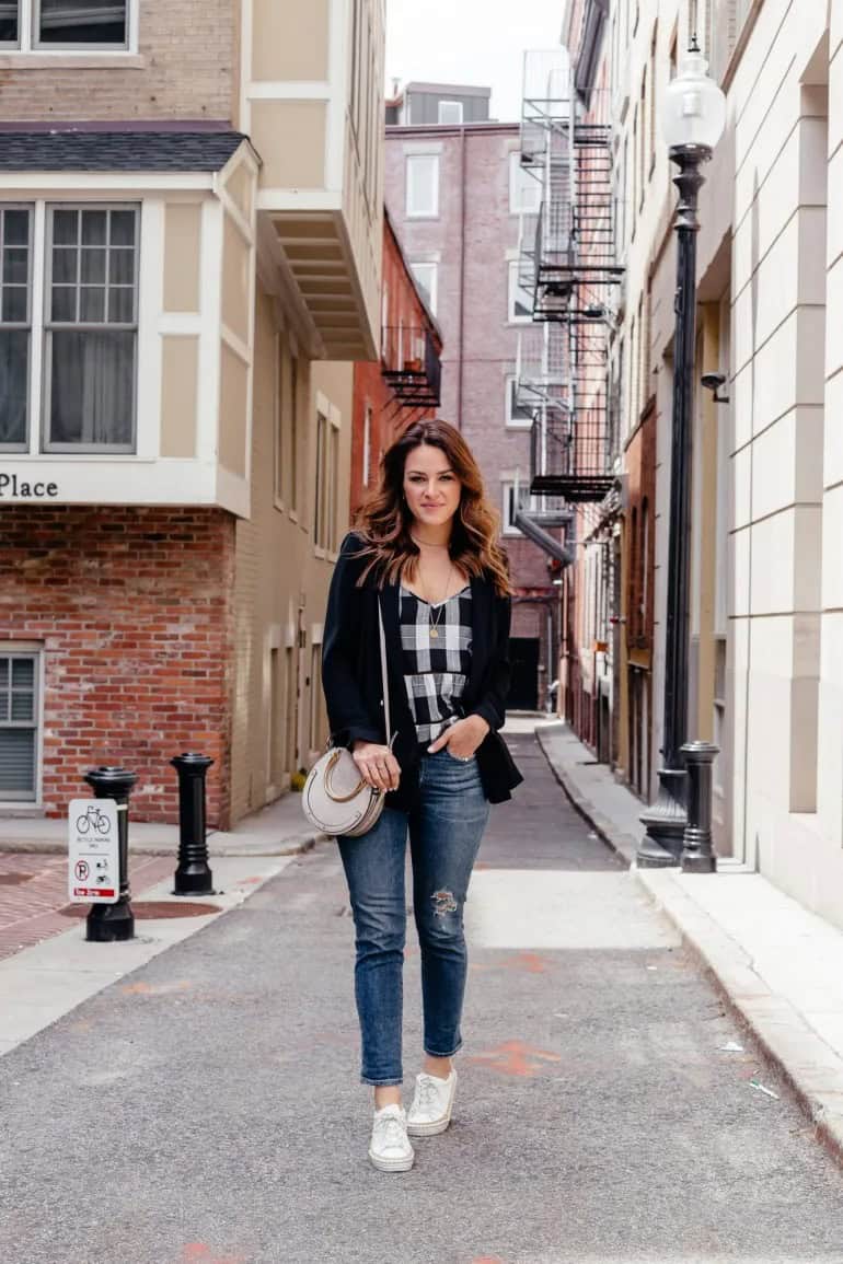 Embrace Boston’s crisp autumn air with this effortlessly chic ensemble. The combination of a structured black blazer and a casual plaid top strikes the perfect balance between polished and relaxed. Paired with distressed skinny jeans and white sneakers, this outfit is ideal for strolling through historic Beacon Hill or grabbing a pumpkin spice latte in the North End. The neutral-toned crossbody bag adds a touch of sophistication while keeping your essentials close at hand. This versatile look transitions seamlessly from day to night, making it a must-have for your fall wardrobe in the Hub.