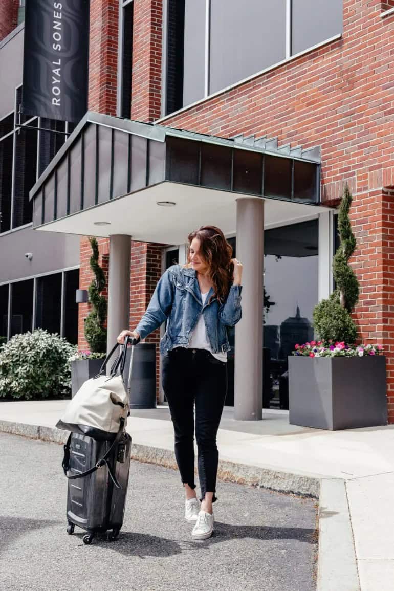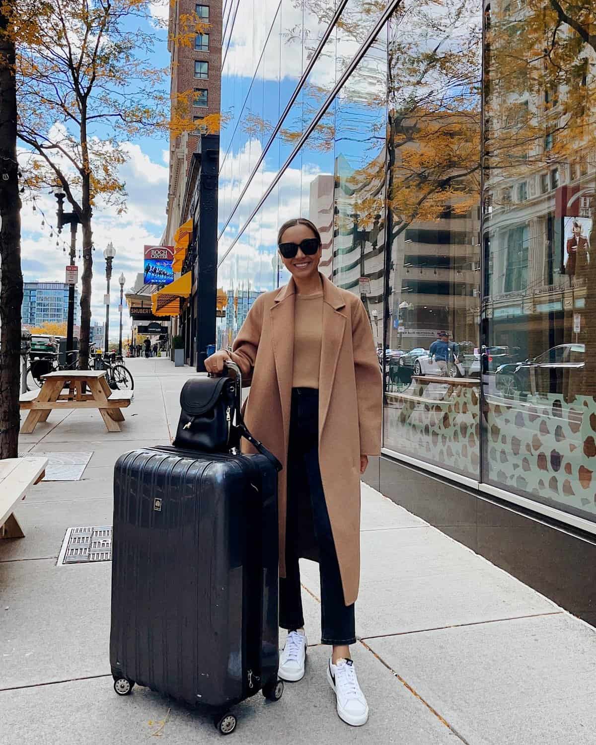 Embrace the quintessential Boston fall look with this effortlessly chic ensemble. The star of this outfit is undoubtedly the luxurious camel coat, a timeless piece that exudes warmth and sophistication. Paired with dark jeans and crisp white sneakers, this look strikes the perfect balance between comfort and style for exploring the city’s autumn landscape. The neutral tones harmonize beautifully with the golden foliage, while the oversized sunglasses add a touch of mystery and glamour. This versatile outfit is ideal for everything from casual coffee runs to impromptu weekend getaways, as evidenced by the stylish luggage. It’s a prime example of how to stay cozy and fashionable during Boston’s brisk fall days.