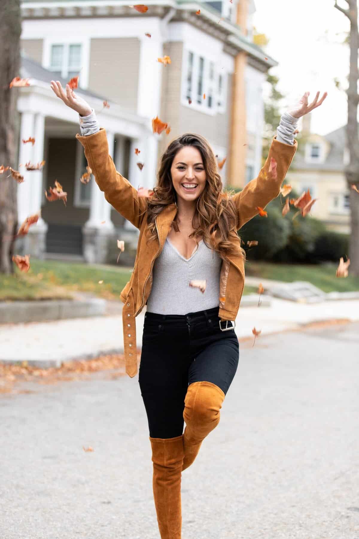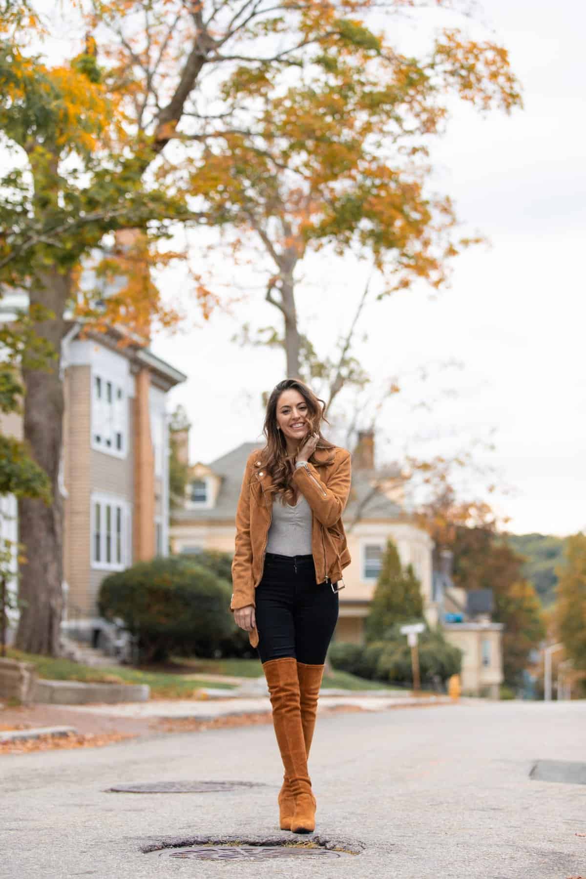 Embrace the warm tones of fall with this striking ensemble that perfectly captures Boston’s autumnal spirit. A rich caramel suede jacket adds a luxurious touch, complemented by matching over-the-knee boots that elongate the silhouette. The combination of black skinny jeans and a light-colored top creates a balanced contrast, ideal for navigating the city’s crisp weather. This outfit effortlessly blends comfort and style, making it perfect for strolling through leaf-strewn streets or enjoying a pumpkin spice latte at a cozy café. The earth-toned palette harmonizes beautifully with the changing foliage, ensuring you’ll turn heads while feeling snug and chic in the heart of New England’s fall season.