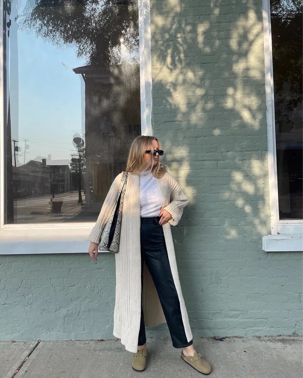 Embrace the crisp Boston autumn with this sophisticated ensemble that perfectly balances comfort and style. The star of this outfit is the luxurious cream-colored longline cardigan, offering both warmth and an effortlessly chic silhouette. Paired with classic dark trousers and a white tee, it creates a timeless look ideal for strolling through historic Beacon Hill or grabbing a pumpkin spice latte downtown. The outfit is cleverly accessorized with trendy sunglasses and a snakeskin-print bag, adding a touch of urban flair. Comfortable yet fashionable olive mules complete the look, ensuring you can explore the city’s cobblestone streets in style. This versatile combination is perfect for transitioning from cool mornings to sunny afternoons in New England’s vibrant fall season.