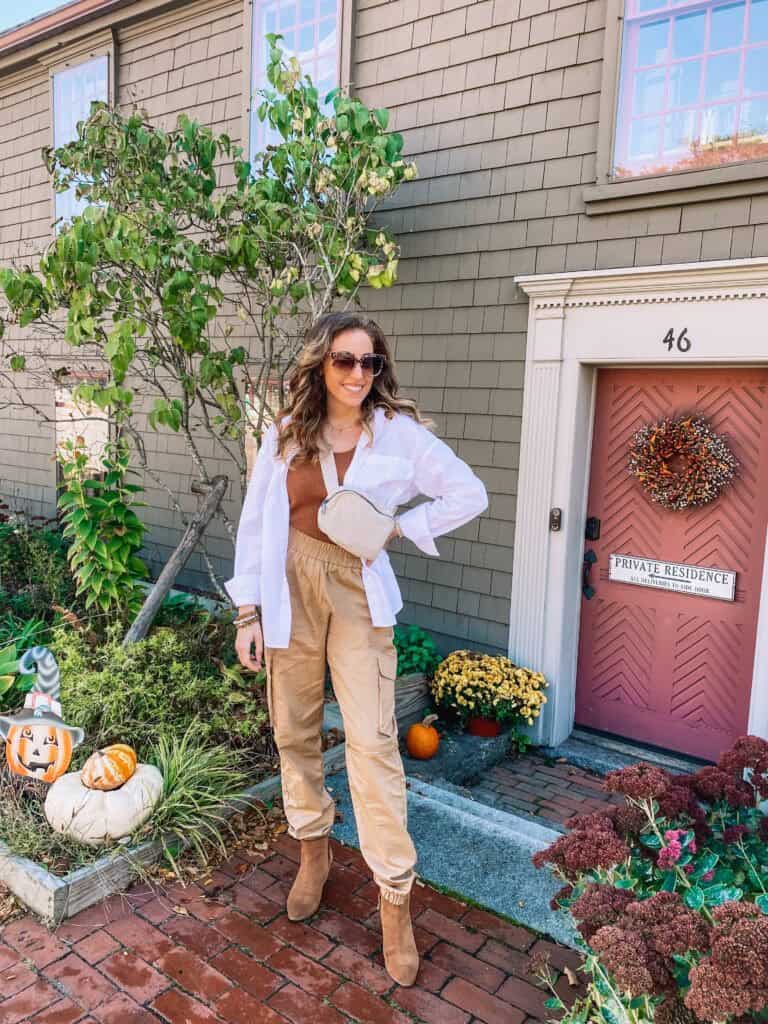 Embrace the essence of Boston’s fall with this effortlessly chic ensemble that combines comfort and style. The outfit features a crisp white button-down shirt layered over a warm rust-colored top, paired with relaxed khaki cargo pants. Camel-toned ankle boots add a touch of sophistication while keeping the look casual. Accessorized with oversized sunglasses and a neutral crossbody bag, this outfit is perfect for strolling through historic neighborhoods or enjoying a pumpkin spice latte at a quaint café. The neutral palette allows the vibrant fall foliage to take center stage, making it an ideal choice for capturing those Instagram-worthy moments against Boston’s picturesque autumn backdrop.