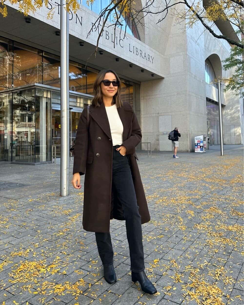 This ensemble epitomizes Boston’s fall fashion with its perfect blend of sophistication and practicality. The long, dark brown coat adds an air of elegance while providing warmth for those crisp autumn days. Paired with sleek black boots and jeans, it creates a versatile look suitable for both work and weekend outings. The cream-colored top underneath adds a touch of brightness, balancing the darker tones. Accessorized with stylish sunglasses, this outfit showcases how Bostonians can stay chic while navigating the city’s cultural hotspots, like the public library seen in the background. The fallen leaves scattered on the ground complete the quintessential fall scene, making this look a standout choice for the season.