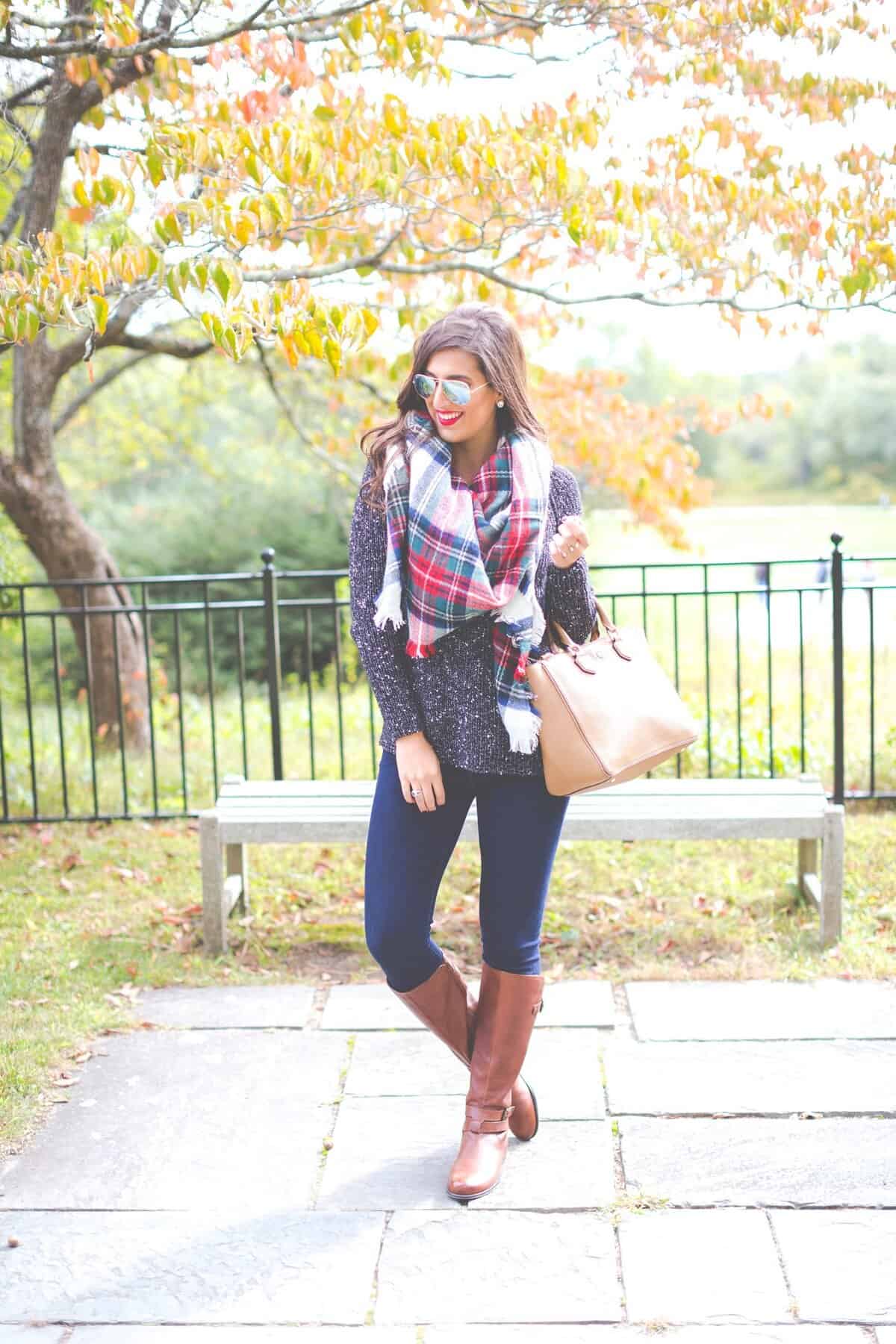 Embrace the quintessential Boston fall look with this chic ensemble that combines comfort and style. A chunky knit sweater in a versatile charcoal hue serves as the perfect base, paired effortlessly with sleek navy leggings. The outfit’s standout piece is undoubtedly the oversized plaid scarf, featuring warm reds and blues that capture the essence of autumn. Cognac leather boots add a touch of sophistication while keeping you prepared for crisp walks through the city. Accessorize with trendy aviator sunglasses and a neutral tote to complete this head-turning look that’s both cozy and fashion-forward. This outfit effortlessly transitions from leaf-peeping in the Public Garden to sipping pumpkin spice lattes on Newbury Street.