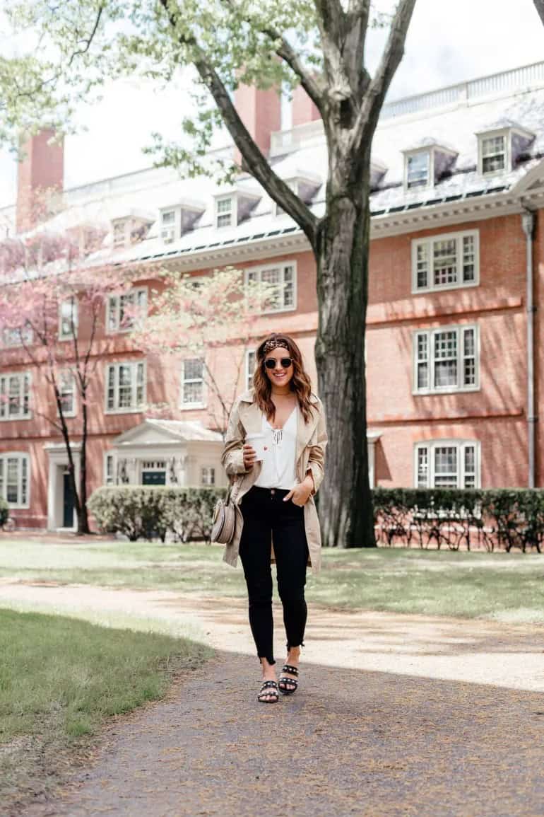 Embrace the crisp Boston fall with this effortlessly chic ensemble perfect for a stroll through historic campus grounds. The classic beige trench coat adds a layer of sophistication while providing warmth against the autumn breeze. Paired with a white V-neck top and sleek black jeans, this outfit strikes the ideal balance between comfort and style. The look is accessorized with trendy sunglasses, a patterned headband, and stylish sandals, making it versatile for both casual outings and impromptu coffee dates. The neutral color palette allows the vibrant fall foliage to take center stage, creating a harmonious blend with Boston’s picturesque collegiate backdrop.