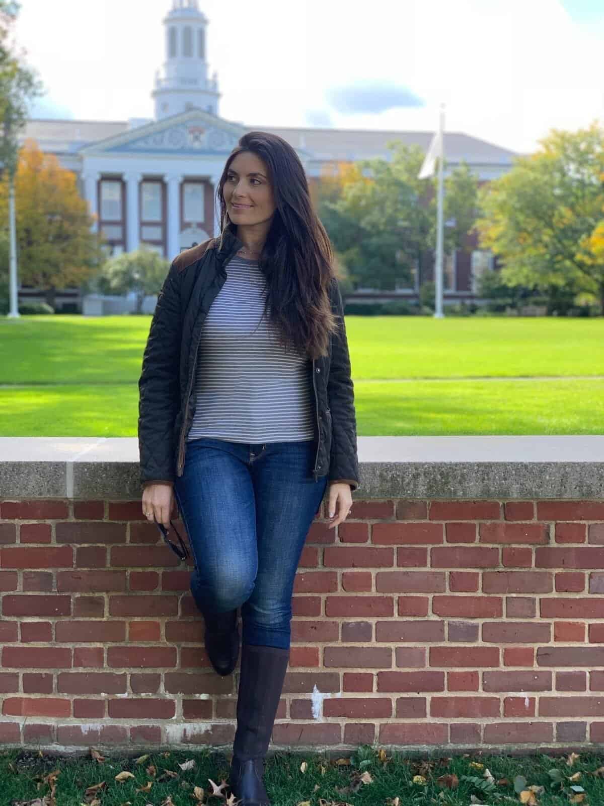 Embrace the quintessential Boston fall look with this campus-chic outfit that seamlessly blends comfort and style. The star of this ensemble is the black quilted jacket, providing both warmth and a sleek silhouette perfect for crisp autumn days. Paired with a classic striped top and fitted blue jeans, this outfit strikes the ideal balance between casual and put-together. The dark boots add a touch of sophistication while being practical for navigating city streets or campus paths. This look embodies the cozy yet fashionable vibe that Boston’s fall fashion is known for, allowing you to transition effortlessly from lectures to coffee dates while turning heads with your understated elegance.
