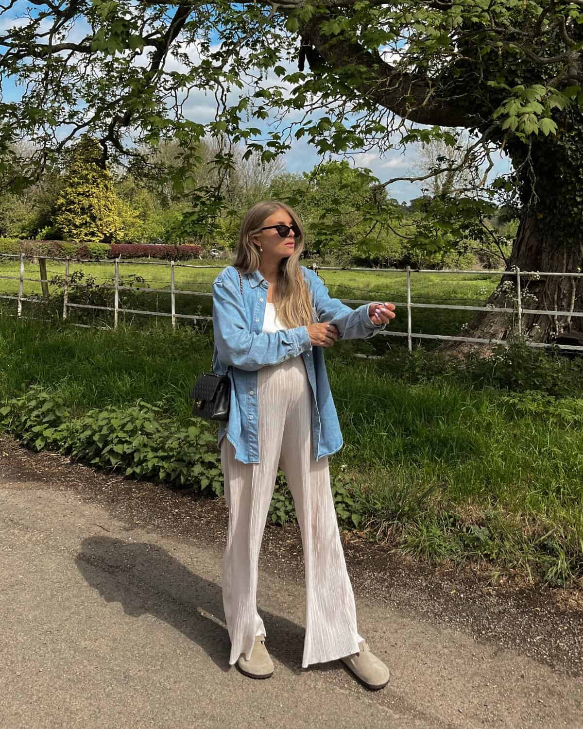 Embrace the crisp Boston fall with this effortlessly chic ensemble. A light denim overshirt paired with flowing white wide-leg pants creates a perfect balance of casual and sophisticated. The outfit’s airy feel is ideal for those warmer autumn days, while the denim adds a touch of warmth for when the breeze picks up. Accessorize with sleek sunglasses and a classic black handbag to elevate the look. This versatile combination works wonderfully for a leisurely walk through the Public Garden or a coffee date on Newbury Street, showcasing how Boston style can be both comfortable and fashionable as the seasons change.