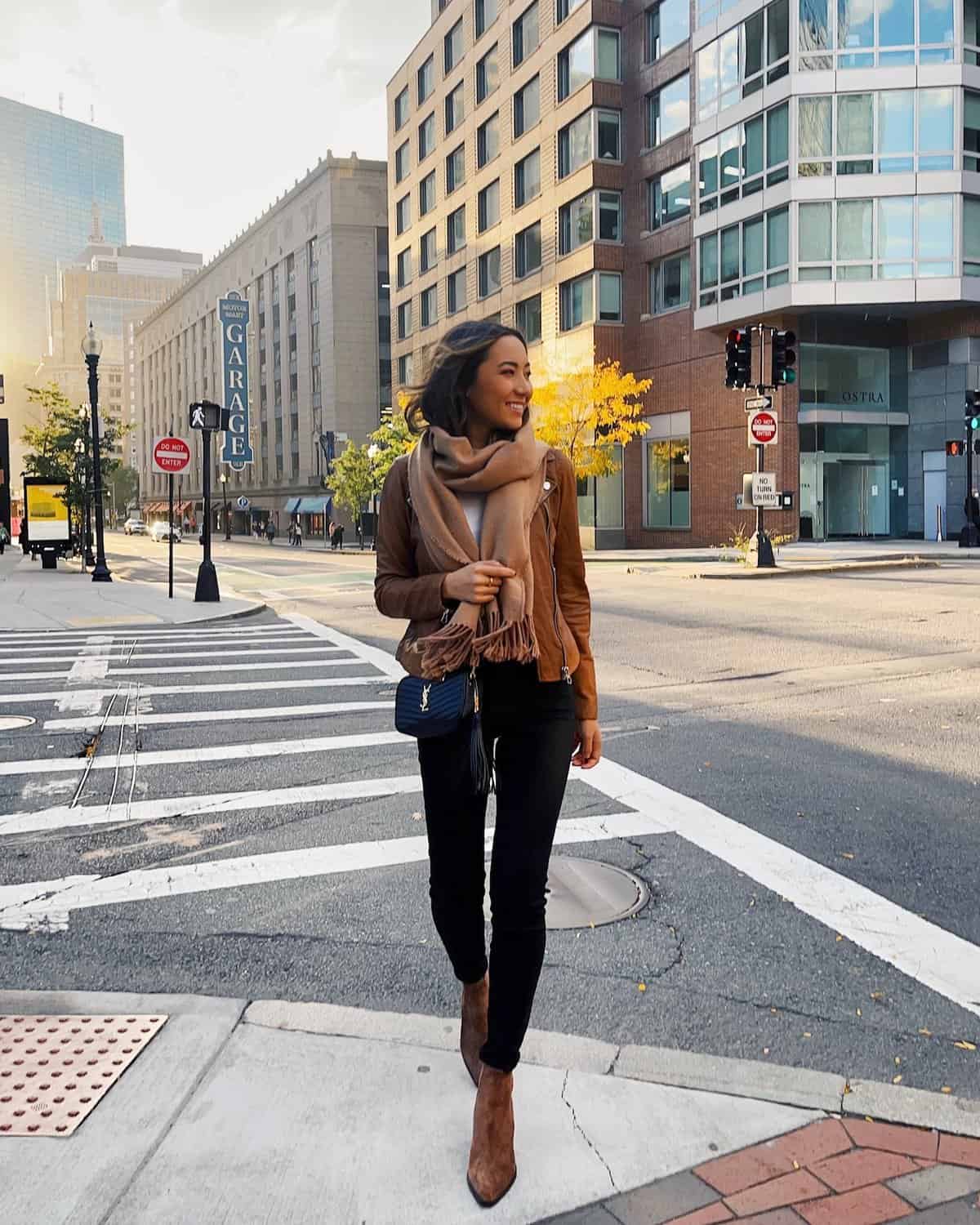 Embrace the crisp Boston autumn air with this effortlessly chic ensemble that perfectly balances style and comfort. The camel-colored jacket adds a touch of warmth and sophistication, while the oversized scarf draped elegantly around the neck provides both coziness and visual interest. Paired with sleek black skinny jeans and brown ankle boots, this outfit is ideal for strolling through the historic streets of Boston or grabbing a pumpkin spice latte at a trendy café. The navy crossbody bag adds a pop of contrast and keeps your essentials close at hand. This look exemplifies how to layer effectively for fall while maintaining a polished and put-together appearance that’s sure to turn heads in the city.