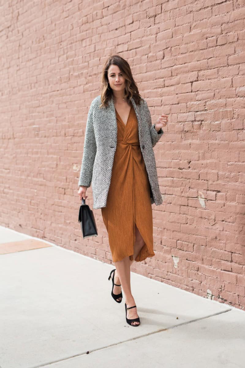 This ensemble perfectly captures the essence of a chic fall outfit, combining warmth and style. The textured grey coat adds a cozy layer over a stunning rust-colored midi dress, creating a harmonious autumnal color palette. The wrap-style dress cinched at the waist flatters the silhouette, while its deep V-neckline adds a touch of elegance. Black strappy heels and a matching handbag complete the look with sophistication. This outfit demonstrates how a well-chosen coat can elevate a simple dress, making it suitable for various fall occasions. The mix of textures and warm hues embodies the cozy yet fashionable spirit of autumn dressing.