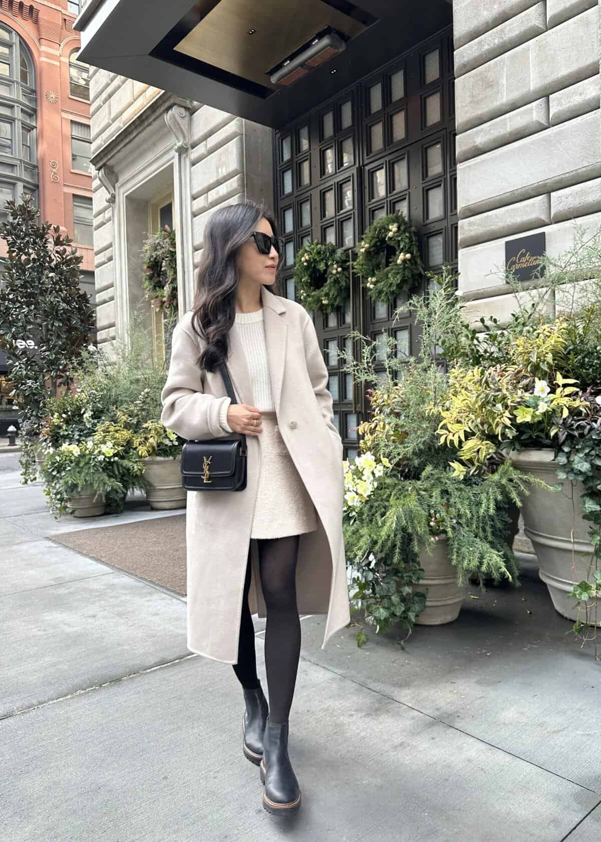 This sophisticated cream-colored coat exemplifies the perfect blend of cozy and chic for fall. The long, streamlined silhouette offers both warmth and style, making it an ideal choice for elevating your autumn wardrobe. Paired with a cream sweater, black tights, and ankle boots, this ensemble creates a sleek monochromatic look that’s perfect for navigating city streets. The coat’s neutral tone allows for versatile styling options, while its luxurious appearance adds a touch of elegance to any outfit. Accessorized with oversized sunglasses and a classic black handbag, this look demonstrates how a well-chosen coat can serve as the centerpiece of a polished fall ensemble.