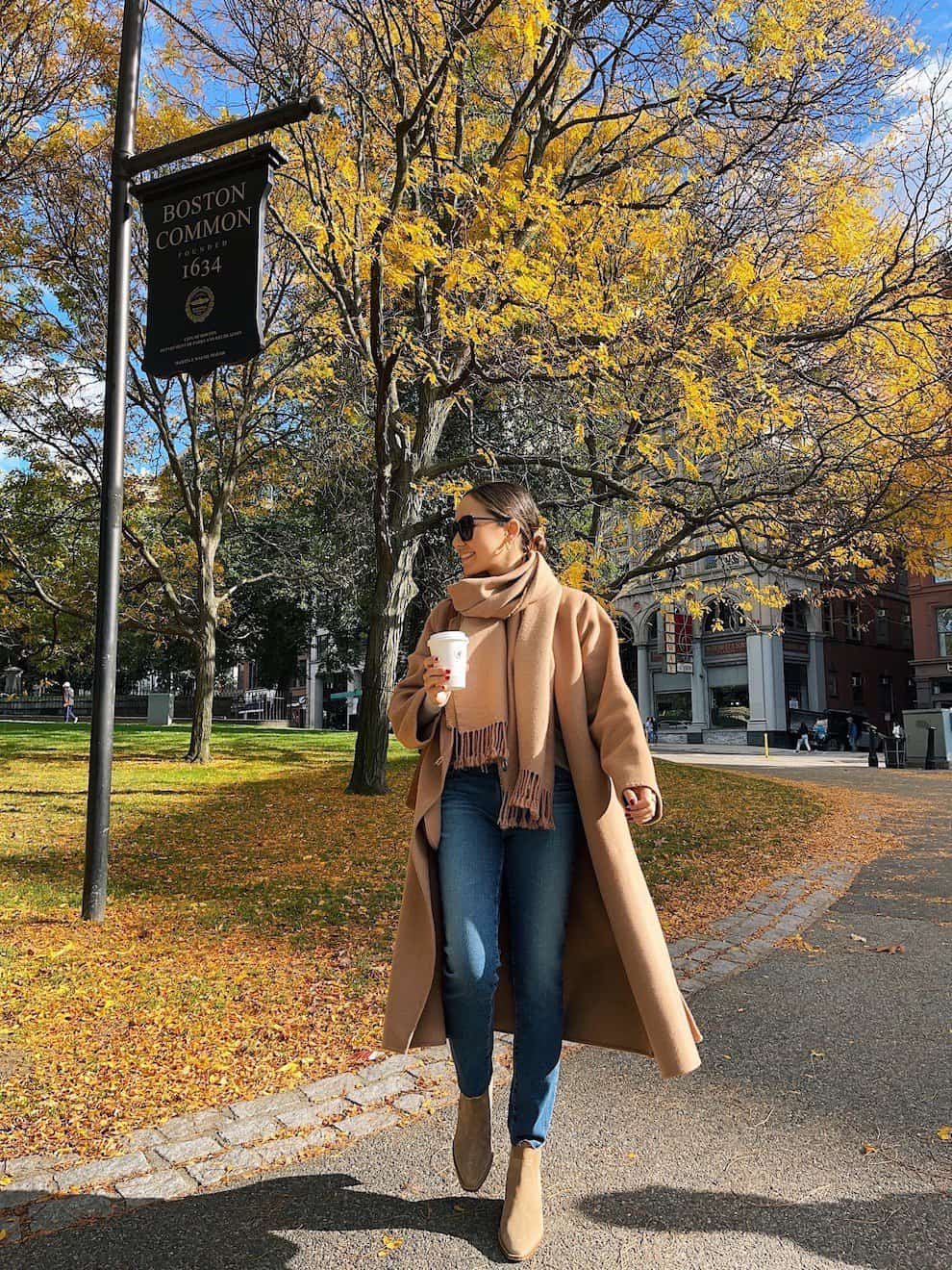 Embrace the crisp fall air with this chic and versatile camel coat ensemble. Perfect for a leisurely walk through Boston Common, this outfit effortlessly combines style and comfort. The long, flowing camel coat serves as the centerpiece, offering both warmth and elegance. Paired with a matching scarf, dark jeans, and camel-colored ankle boots, this look creates a cohesive and polished appearance. The neutral tones of the outfit beautifully complement the golden hues of autumn foliage, making it an ideal choice for seasonal outings. Whether you’re sipping a hot beverage or simply taking in the scenic views, this coat will keep you cozy and fashionable throughout the fall season.