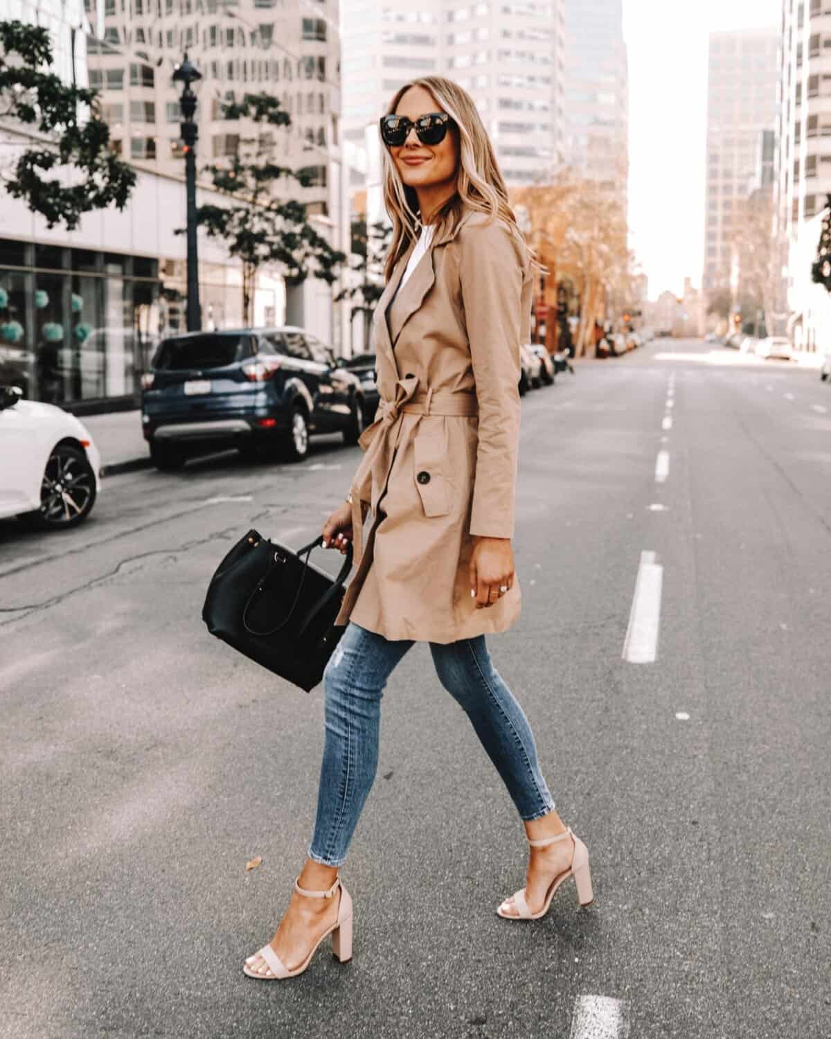 Elevate your autumn wardrobe with this timeless camel trench coat that exudes urban sophistication. The knee-length silhouette and belted waist create a flattering shape, perfect for layering over casual or formal outfits. Paired with slim-fit jeans and nude heels, this ensemble strikes the ideal balance between cozy and chic. The neutral tone of the coat allows for versatile styling, making it a must-have piece for navigating crisp fall days in the city. Accessorized with oversized sunglasses and a sleek black tote, this look embodies effortless elegance and practical warmth for the fashion-forward woman on the go.