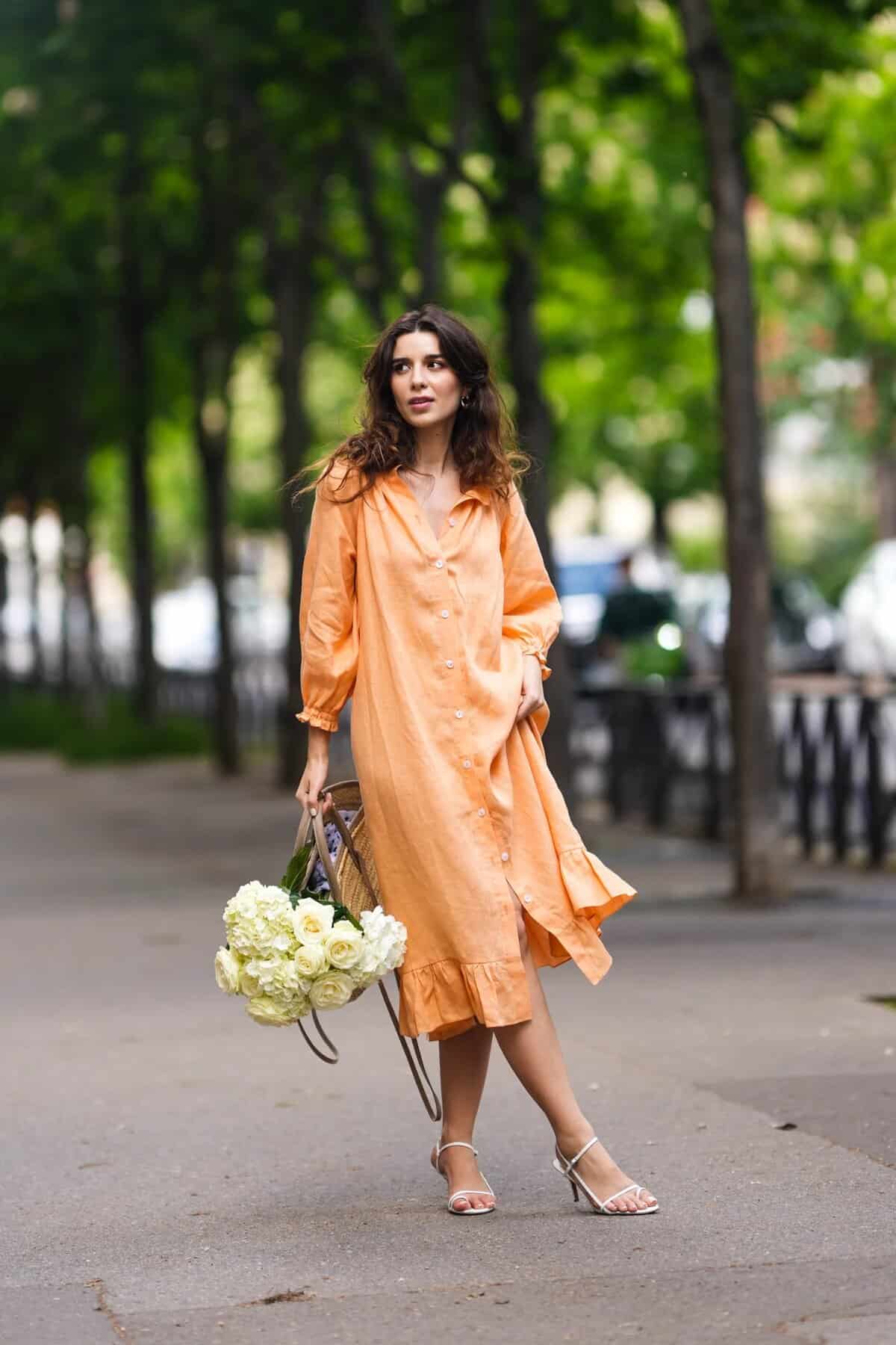 Embrace the crisp autumn air with this effortlessly chic orange button-down midi dress. Perfect for new moms, its loose-fitting silhouette offers comfort and ease of movement, while the cheerful hue adds a pop of color to your fall wardrobe. The long sleeves and midi length provide ample coverage, making it ideal for cooler days. The dress’s versatile design allows for easy nursing access, and its lightweight fabric ensures you stay comfortable throughout the day. Pair it with strappy sandals for a casual outing or dress it up with boots for a more polished look. This outfit strikes the perfect balance between style and practicality for postpartum moms.