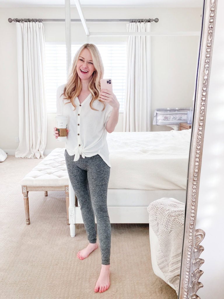 This outfit perfectly balances comfort and style for new moms navigating postpartum life. The loose-fitting white button-down top offers easy nursing access and a put-together look, while the soft, heather gray leggings provide all-day comfort and a flattering silhouette. The top’s tie-front detail adds a trendy touch without sacrificing practicality. This ensemble is ideal for lounging at home or running quick errands, allowing new moms to feel both cozy and presentable. The neutral color palette is versatile and easy to accessorize, making it a go-to choice for busy days. It’s an excellent example of how postpartum fashion can be both functional and fashionable.