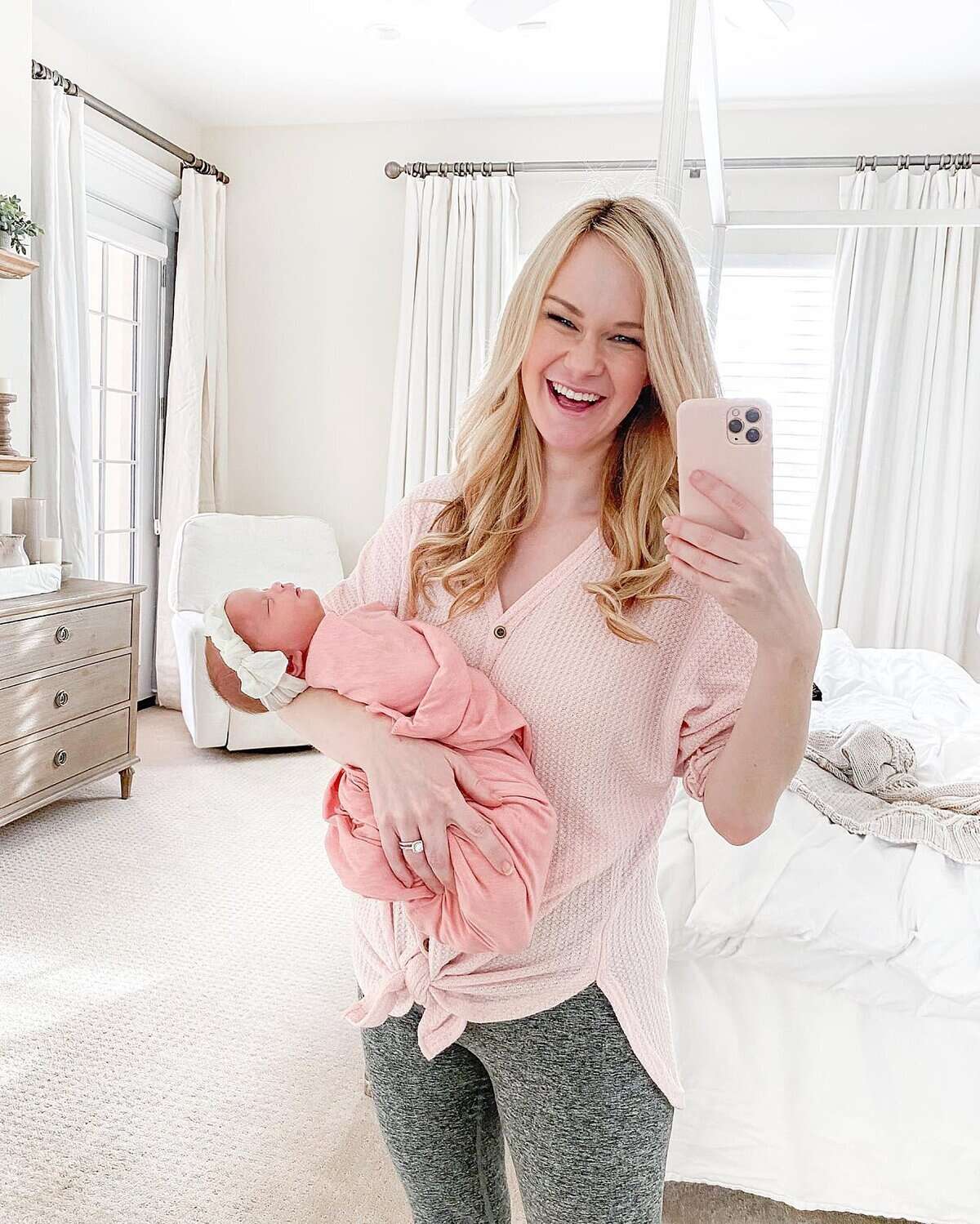 Embrace comfort and style with this effortlessly chic postpartum outfit. The soft, blush-pink knit cardigan offers warmth and versatility, perfect for those chilly fall days. Its button-front design allows for easy nursing access, while the loose fit accommodates a changing postpartum body. Paired with comfortable grey leggings, this ensemble provides the stretch and support new moms need. The cardigan’s knotted front detail adds a trendy touch, making it easy to feel put-together even during those sleepless nights. This outfit strikes the ideal balance between cozy and fashionable, ensuring new moms feel confident and comfortable as they navigate their postpartum journey.