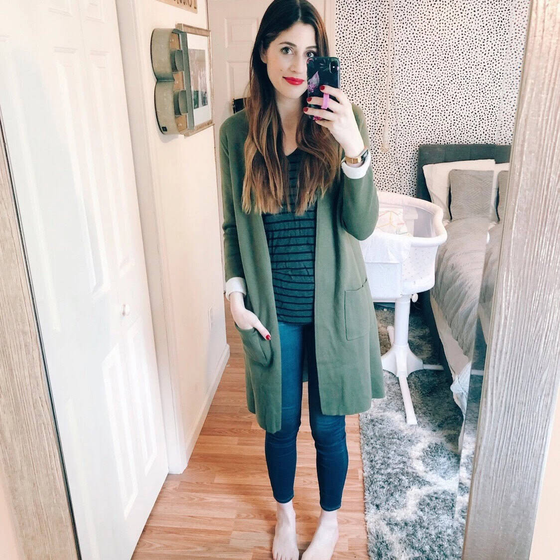 This effortlessly chic ensemble combines comfort and style, perfect for new moms navigating the postpartum period. The long olive cardigan offers warmth and coverage, ideal for those cooler fall days. Its relaxed fit accommodates a changing body while the deep pockets provide practicality for storing essentials. Underneath, a navy striped tee adds a classic touch, easily paired with comfortable skinny jeans. This outfit allows for easy nursing access and offers a put-together look with minimal effort. The layers make it adaptable for temperature changes, whether you’re at home or stepping out for a quick errand. It’s a versatile choice that balances new mom practicality with on-trend fall fashion.