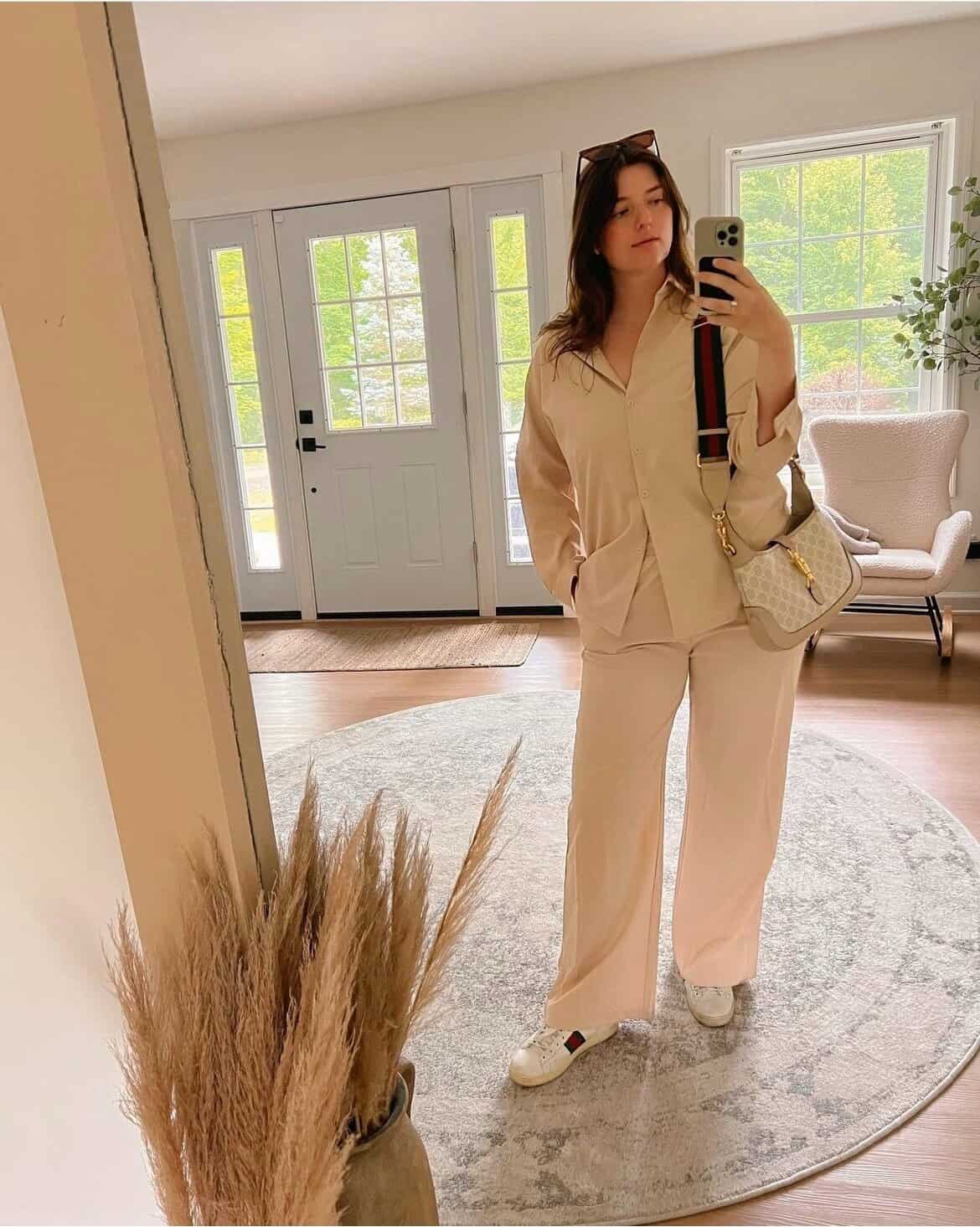 This ensemble exemplifies the perfect balance of comfort and style for new moms navigating the postpartum period. The loose-fitting beige shirt and wide-leg pants offer a chic, put-together look while providing the ease of movement essential for caring for a newborn. The neutral palette is versatile and seasonally appropriate, making it an ideal choice for fall. Paired with comfortable yet stylish shoes and a designer handbag, this outfit allows new moms to feel confident and fashionable while running errands or meeting friends for coffee. The overall look is polished and effortless, proving that postpartum fashion can be both practical and sophisticated.