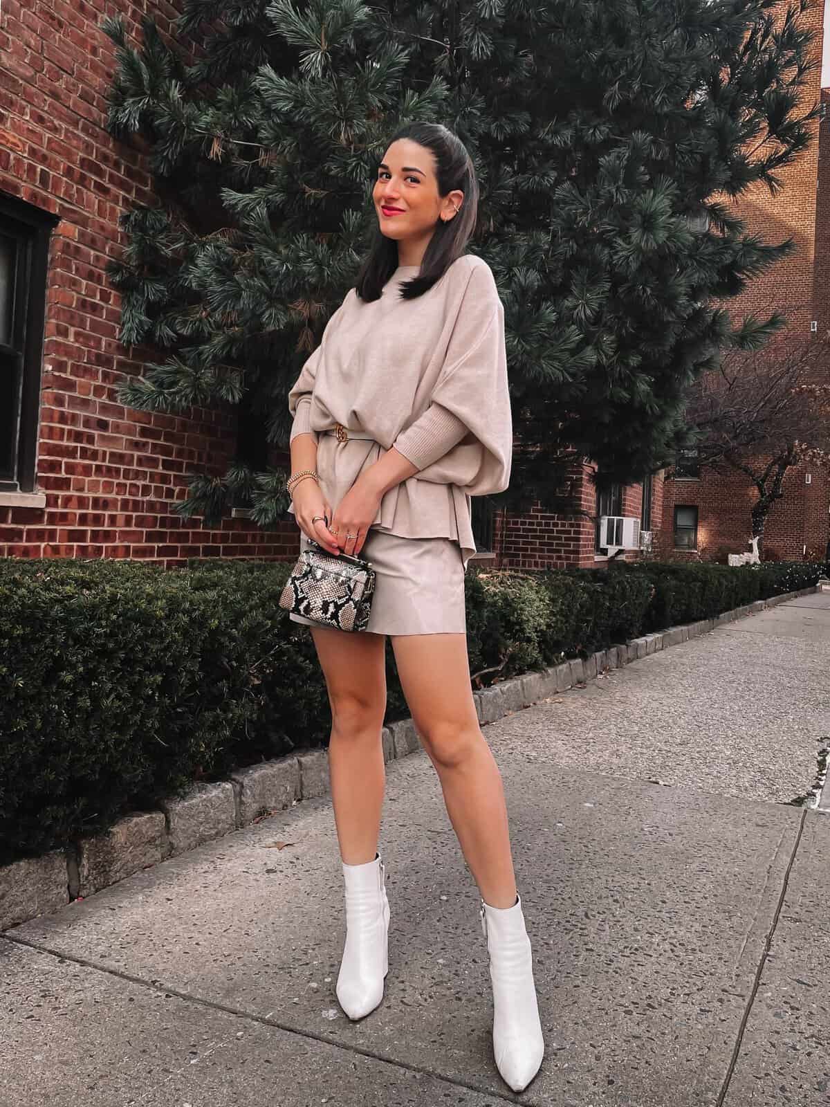 This effortlessly stylish ensemble is perfect for new moms seeking comfort without sacrificing fashion. The oversized beige sweater offers a cozy, relaxed fit that’s ideal for postpartum bodies, while the matching mini skirt adds a touch of elegance. The monochromatic look elongates the silhouette, creating a sleek appearance. White ankle boots provide a modern edge, and the snakeskin-print handbag adds a pop of texture. This outfit strikes the perfect balance between comfort and style, allowing new moms to feel put-together for fall outings or casual meet-ups with friends, all while accommodating the practical needs of early motherhood.