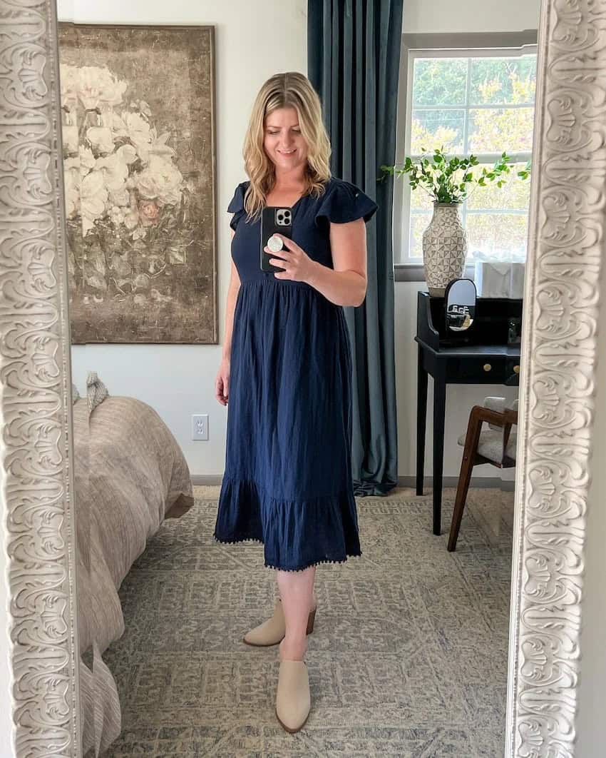 This navy flutter-sleeve midi dress is a perfect addition to any new mom’s fall wardrobe. The soft, flowy fabric offers comfort and ease of movement, ideal for those postpartum days. The empire waistline and gentle gathering provide a flattering silhouette that accommodates a changing body. The midi length offers versatility, pairing well with boots or comfortable flats for running errands or meeting friends. The dark navy color is both slimming and seasonally appropriate, while the delicate flutter sleeves add a touch of femininity. This dress strikes the perfect balance between comfort and style, allowing new moms to feel put-together without sacrificing practicality.