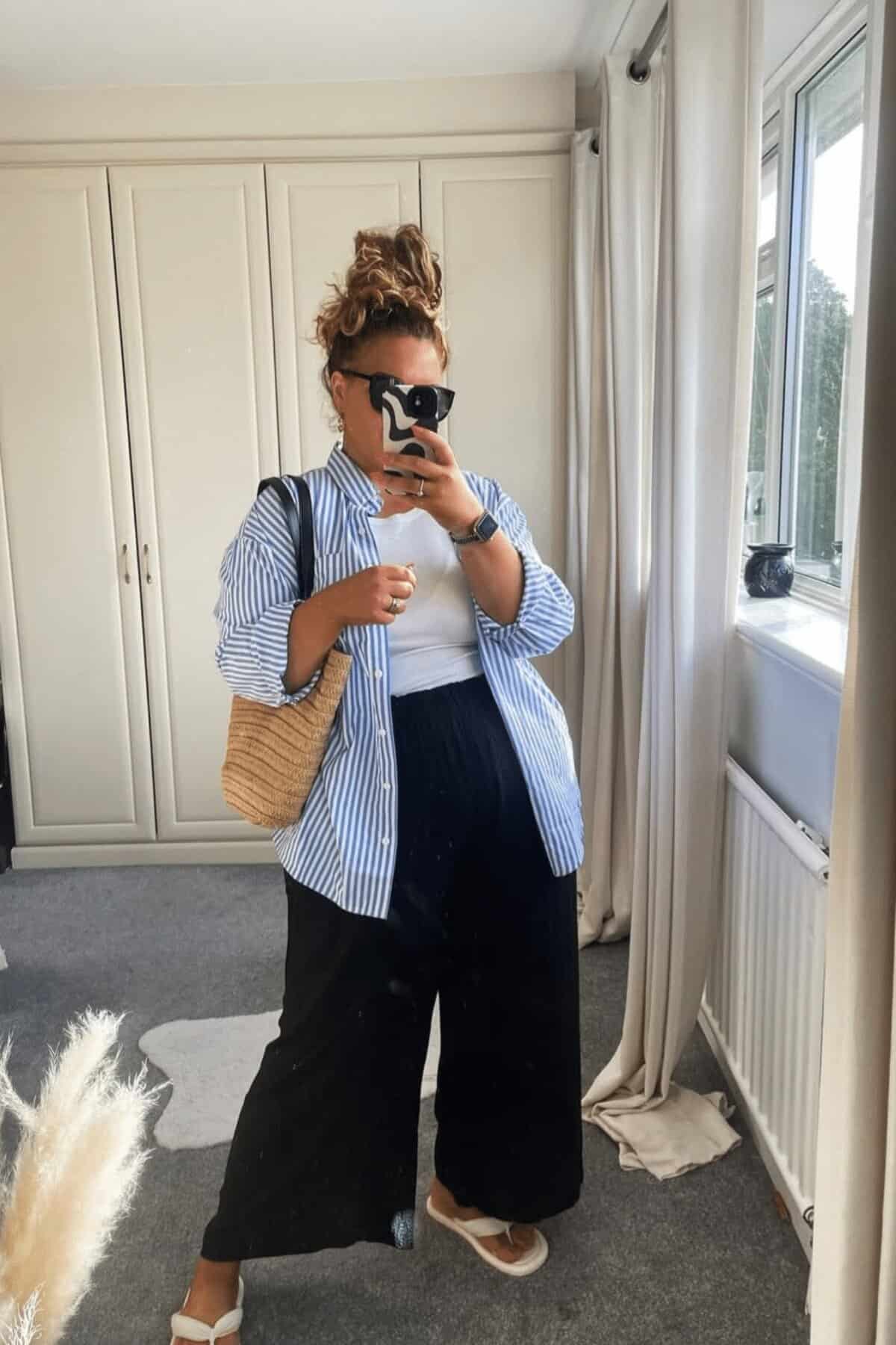 This effortlessly chic ensemble combines comfort and style, perfect for new moms navigating their postpartum wardrobe. The oversized striped button-down shirt layered over a simple white tee offers versatility and ease for nursing. Paired with flowy black wide-leg pants, this outfit provides a flattering silhouette while ensuring maximum comfort. The relaxed fit accommodates changing body shapes, making it an ideal choice for the postpartum period. Accessorized with a straw tote and comfortable sandals, this look is both practical for running errands and stylish enough for casual outings. The messy top knot adds a touch of laid-back elegance, embodying the essence of effortless mom style for fall.
