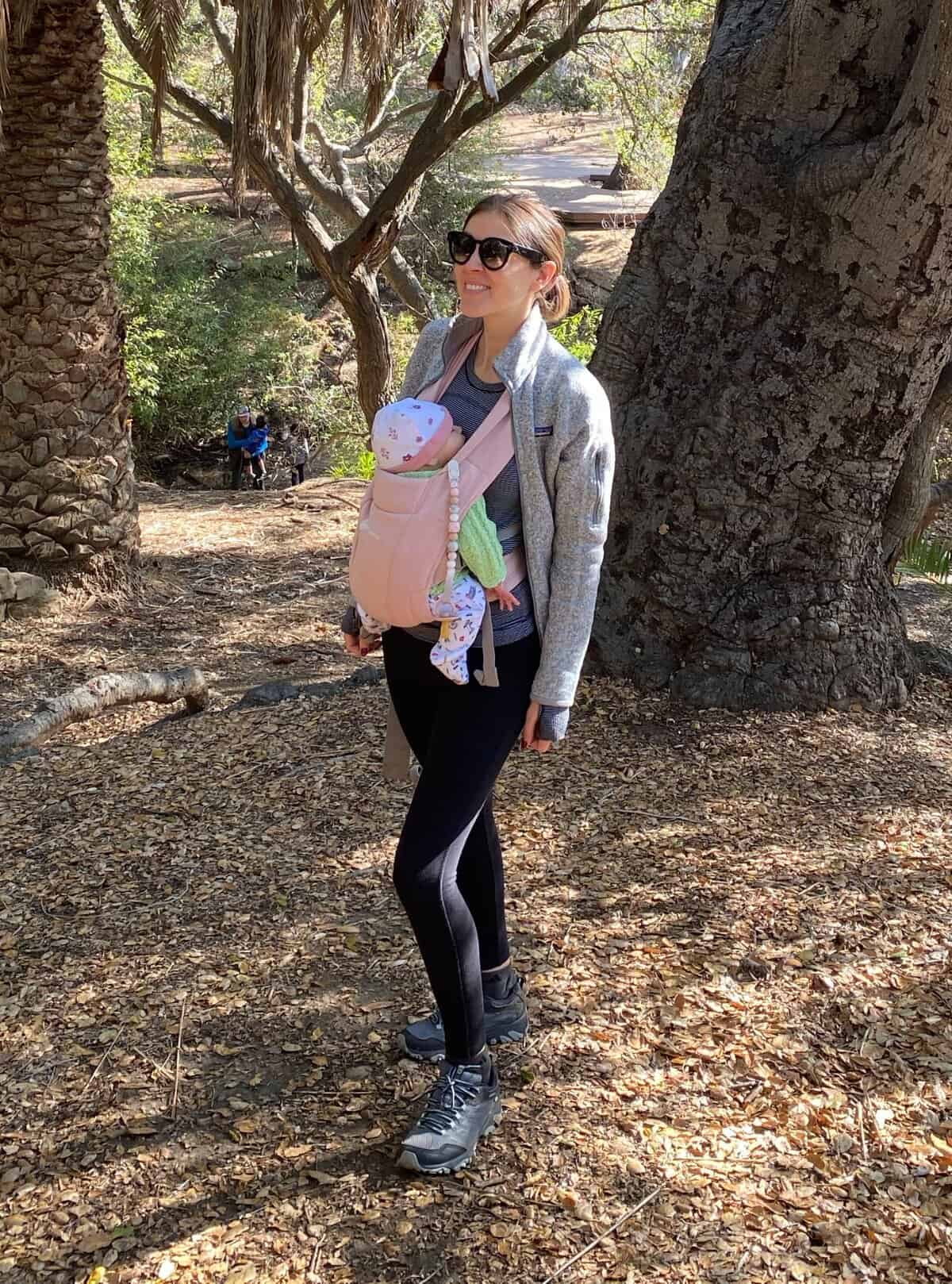 This versatile fall outfit is perfect for new moms who love to stay active and enjoy the outdoors. The ensemble features a comfortable gray fleece jacket layered over a dark athletic top, paired with sleek black leggings and sturdy hiking shoes. The soft, breathable layers provide warmth and flexibility for various activities, while the baby carrier allows for hands-free bonding time. Stylish sunglasses add a touch of chic to the look, making it ideal for both nature walks and casual outings. This outfit demonstrates how new moms can maintain their active lifestyle while prioritizing comfort and practicality in their postpartum wardrobe choices.