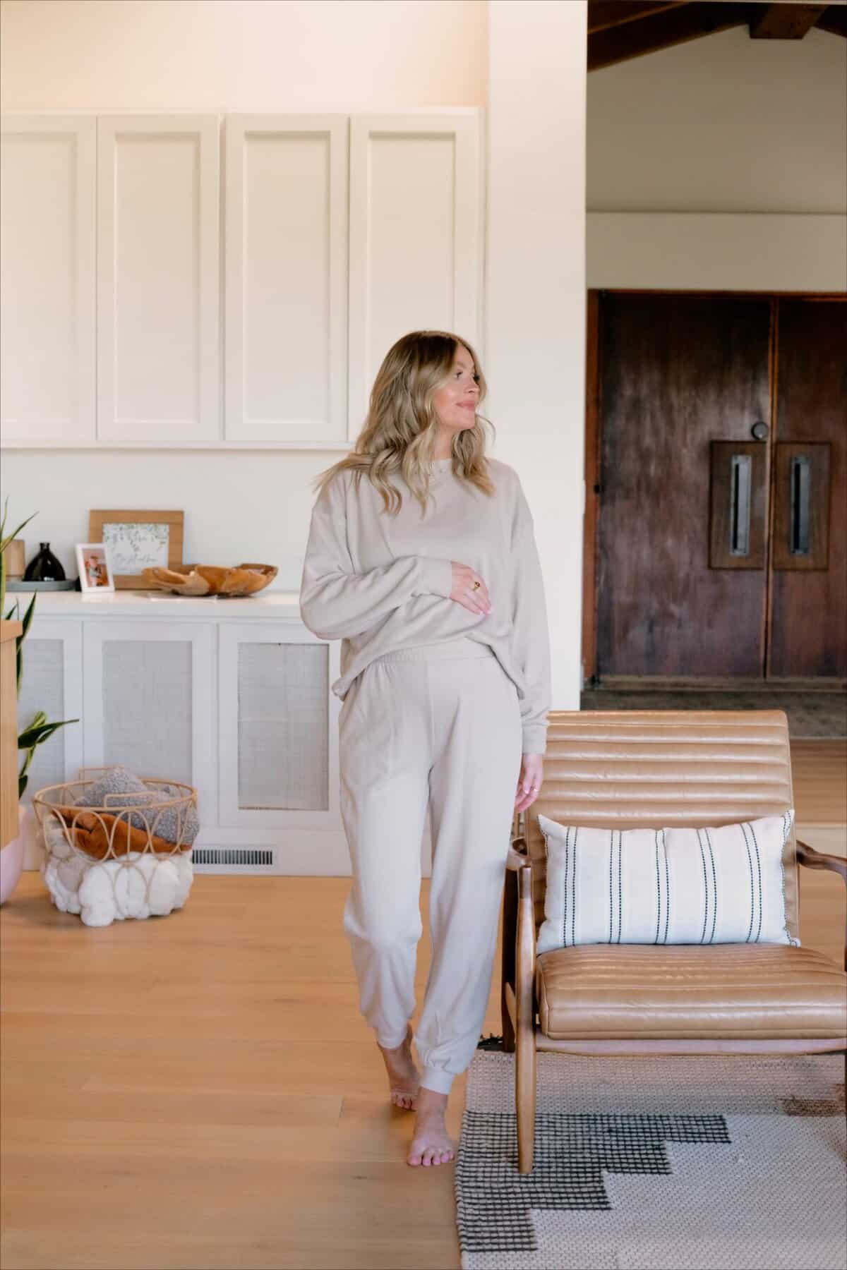 Embrace comfort and style with this effortlessly chic loungewear set in a soothing neutral tone. Perfect for new moms navigating the postpartum period, this ensemble offers a cozy sweatshirt and matching joggers that provide both comfort and a put-together look. The relaxed fit accommodates a changing body, while the soft fabric ensures all-day comfort for feeding and cuddling sessions. The versatile beige color easily pairs with fall accessories, allowing you to transition from home to quick errands with ease. This outfit epitomizes the balance between comfort and style that new moms crave during the autumn season.