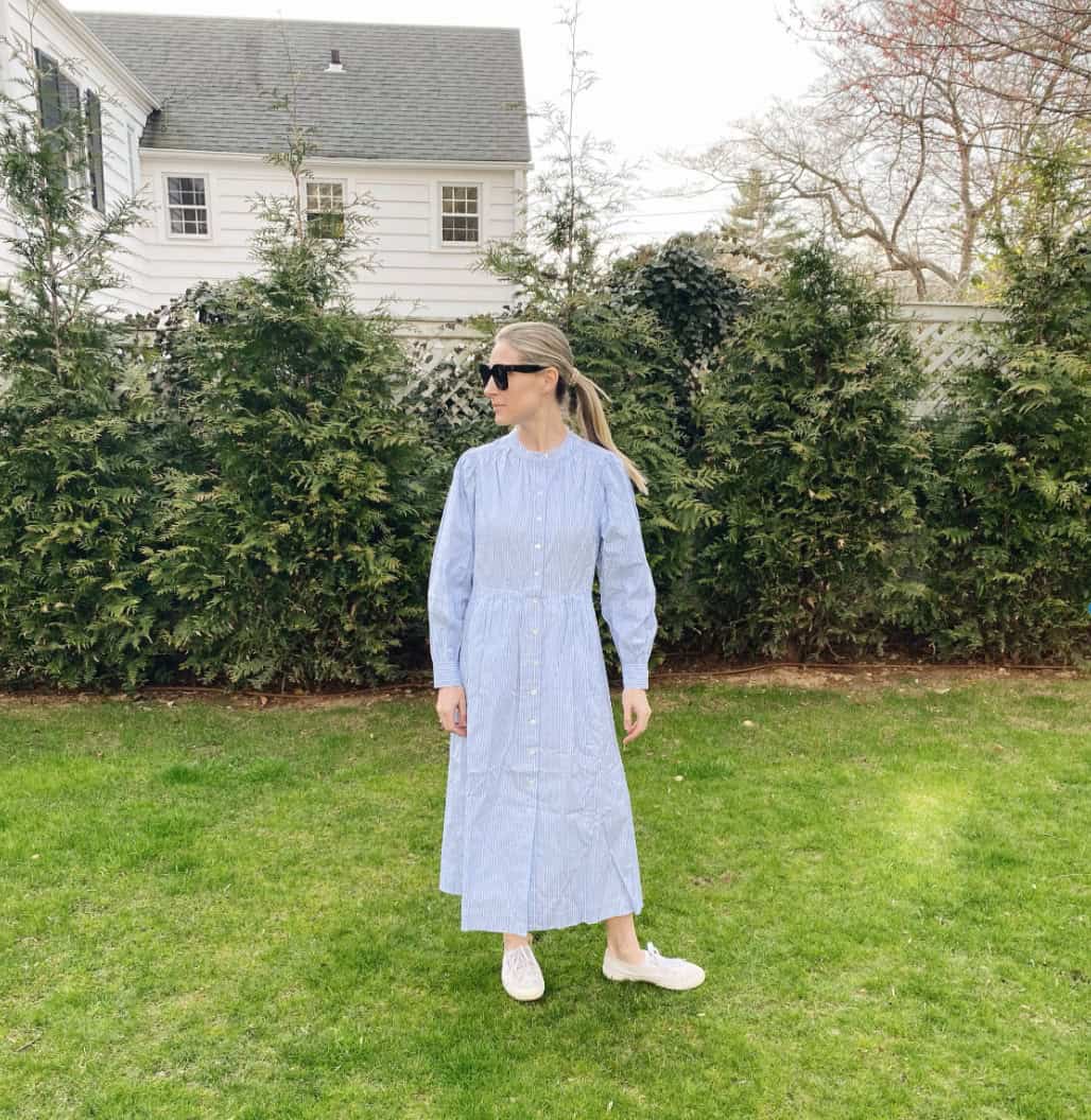This light blue striped maxi dress is a perfect addition to any new mom’s fall wardrobe. The button-down style offers easy access for nursing, while the loose, flowing silhouette provides comfort and flexibility for a changing postpartum body. The long sleeves offer warmth for cooler autumn days, and the lightweight fabric allows for easy layering with cardigans or jackets. Paired with comfortable white sneakers, this outfit strikes the ideal balance between style and practicality. The classic design ensures versatility, making it suitable for casual outings or dressier occasions. This effortlessly chic ensemble allows new moms to feel put-together and confident while managing the demands of motherhood.