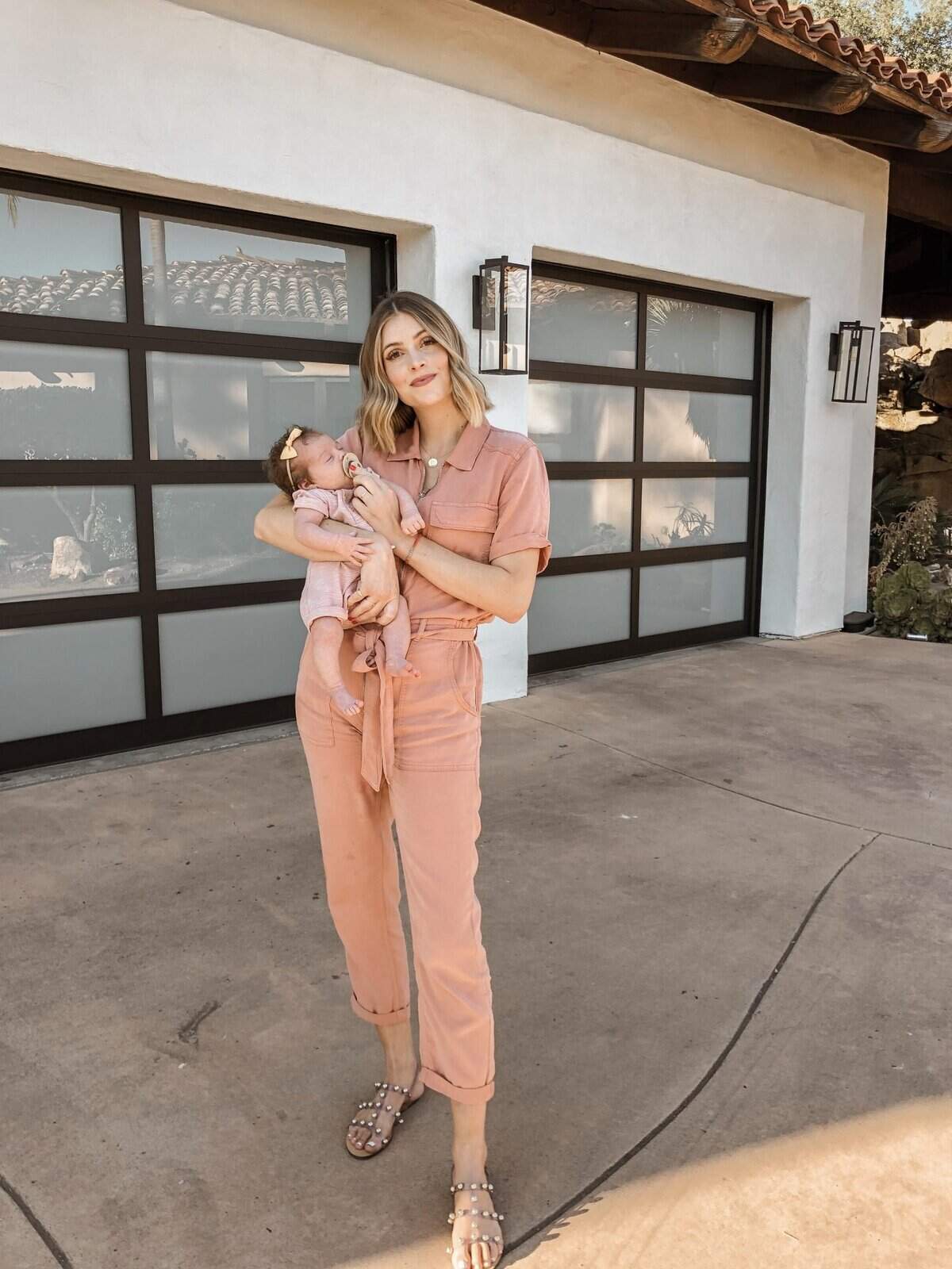 This chic blush pink utility jumpsuit is a perfect addition to any new mom’s fall wardrobe. The soft, muted color exudes warmth and femininity, while the utilitarian style offers practicality for busy postpartum days. The relaxed fit and adjustable waist provide comfort and flexibility, accommodating a changing body. The full-length design offers coverage and warmth for cooler autumn weather, while the rolled-up ankles add a casual touch. Paired with studded sandals, this outfit strikes the ideal balance between comfort and style, allowing new moms to feel put-together while tending to their little ones.