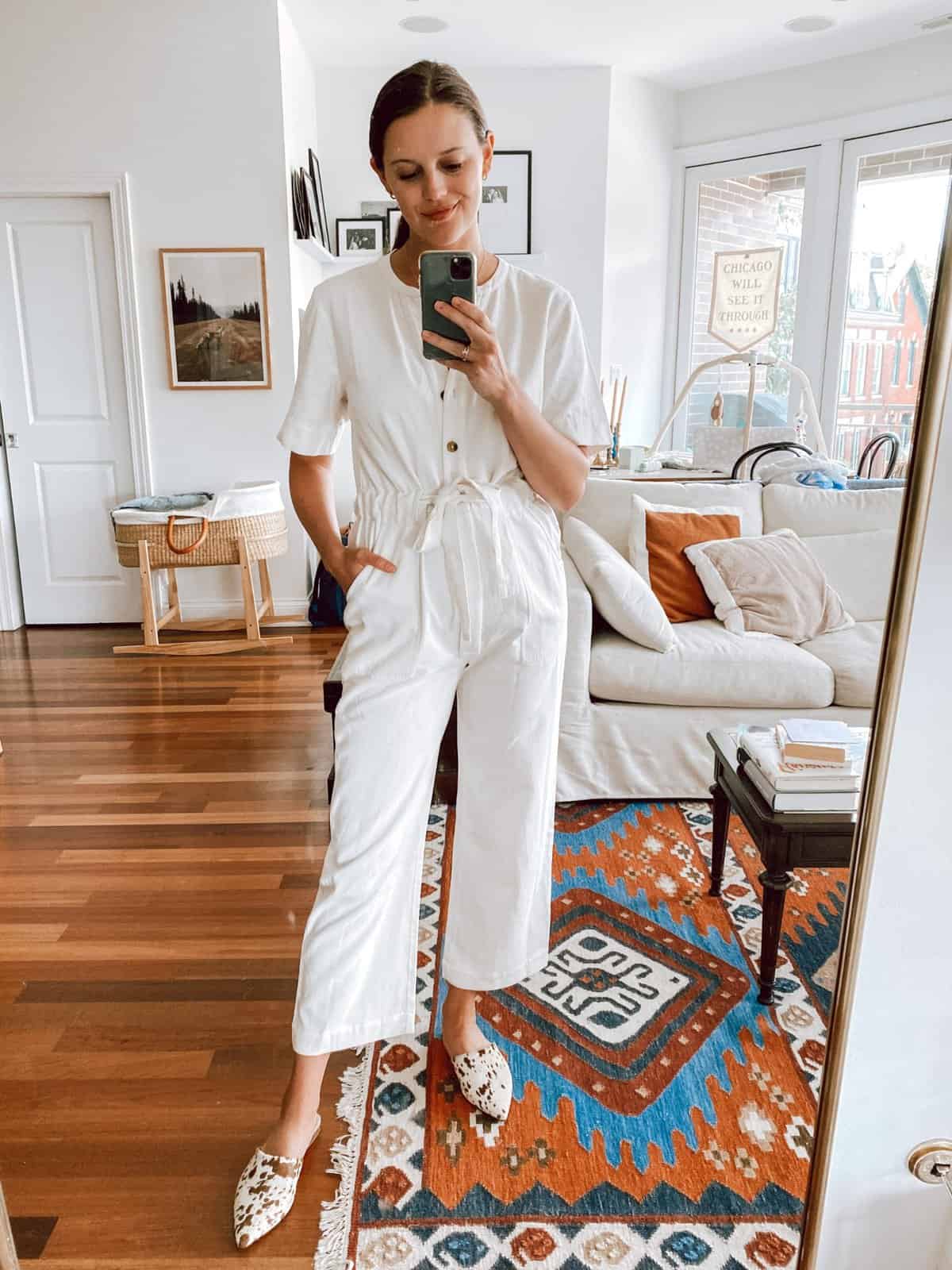 This white jumpsuit is a postpartum wardrobe essential, offering both comfort and style for new moms. The relaxed fit accommodates a changing body, while the drawstring waist provides adjustability and definition. Made from a soft, breathable fabric, it’s perfect for all-day wear during those busy early parenting days. The buttoned front allows for easy nursing access, making it practical for breastfeeding moms. Paired with trendy patterned mules, this outfit effortlessly transitions from cozy home wear to a chic ensemble for quick errands or casual outings. The jumpsuit’s versatility makes it an ideal piece for building a capsule fall wardrobe, easily layered with cardigans or jackets as the weather cools.