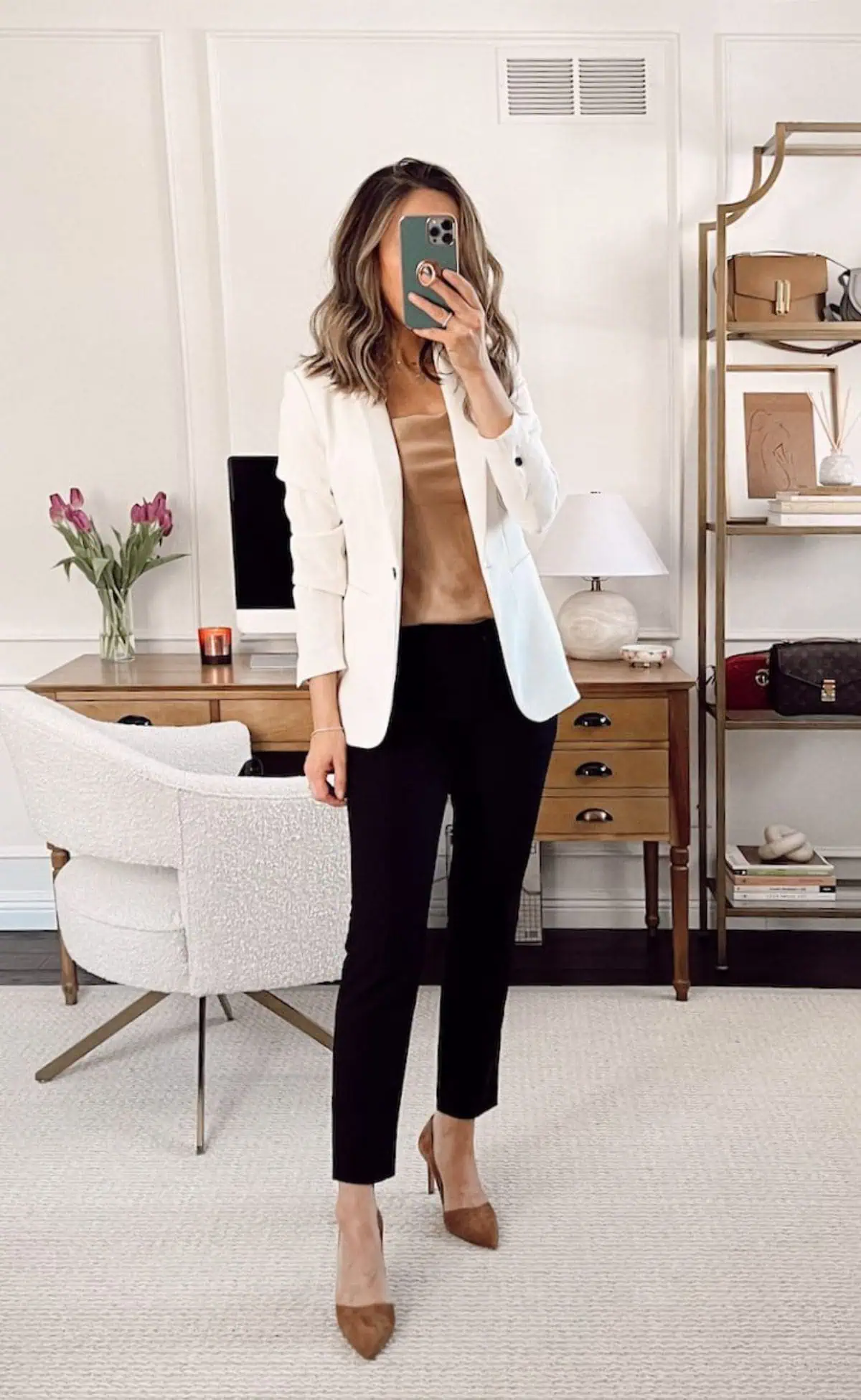 This ensemble exemplifies professional chic for the classroom. The crisp white blazer adds a polished layer over a warm camel-toned top, creating a sophisticated autumn palette.
