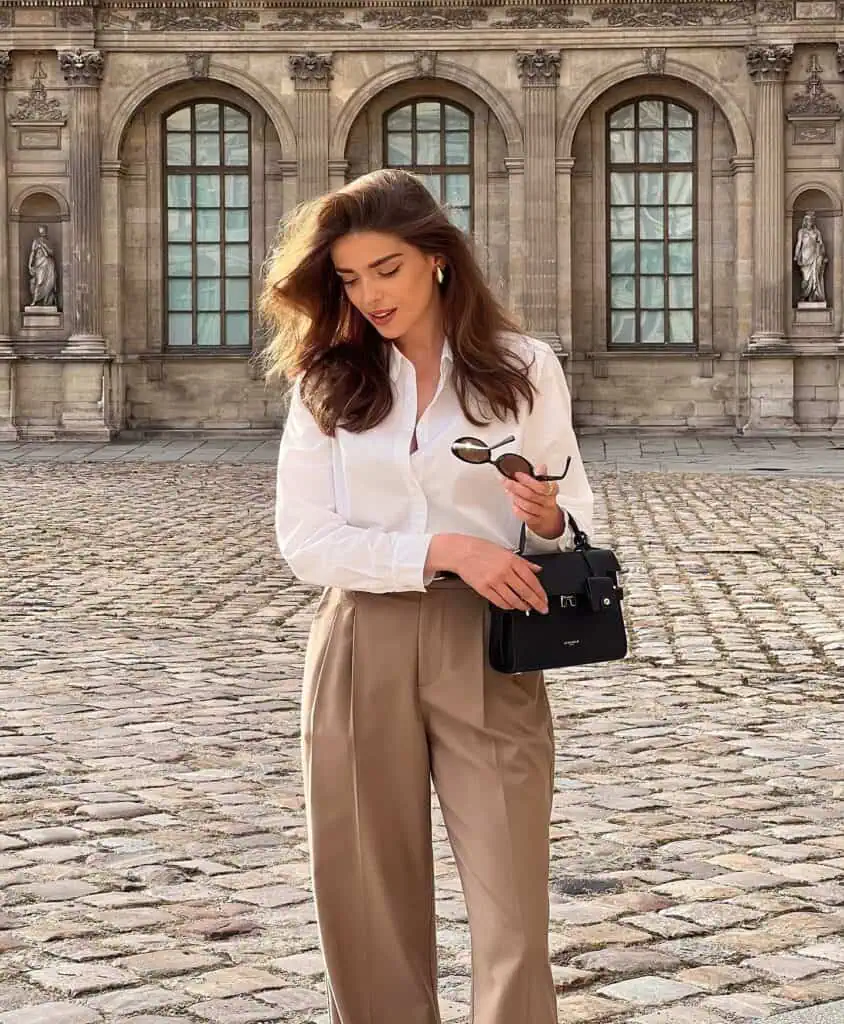 The clean lines of the white shirt create a fresh, polished look, while the neutral-toned trousers offer versatility and comfort. Accessorize with a sleek black handbag and sunglasses for a touch of sophistication.