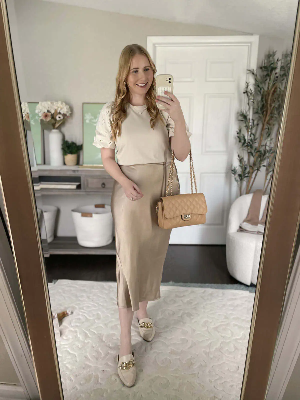 This ensemble exudes sophistication while maintaining comfort, perfect for the classroom. The cream eyelet-detailed top adds a touch of femininity and texture, pairing beautifully with the sleek camel midi skirt.