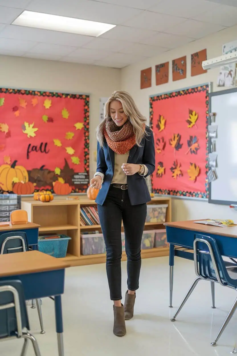 This versatile approach allows teachers to mix and match pieces, creating multiple stylish looks while maintaining a professional appearance throughout the fall season.