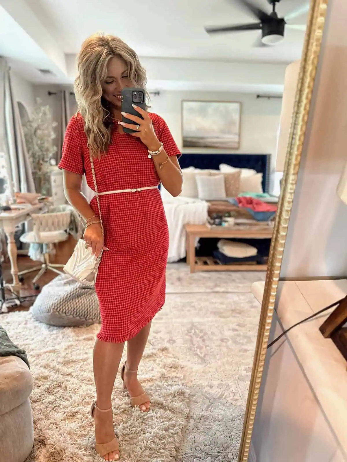 This vibrant red textured dress is a perfect blend of comfort and style for the fall classroom. The knee-length silhouette offers a professional look, while the subtle texture adds visual interest.