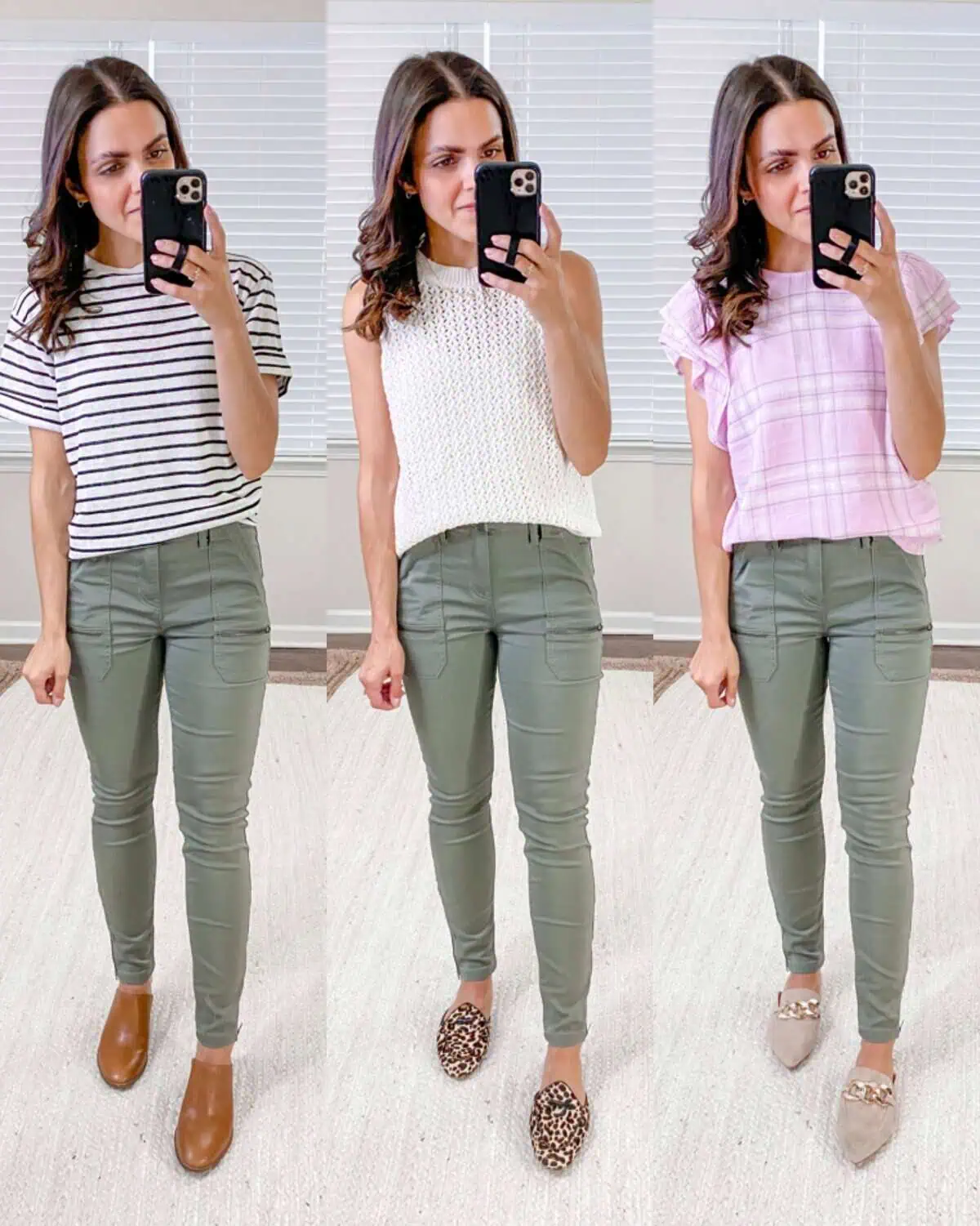 This outfit combination showcases the perfect blend of comfort and style for the classroom. The olive green pants serve as a versatile base, easily paired with various tops to create different looks.