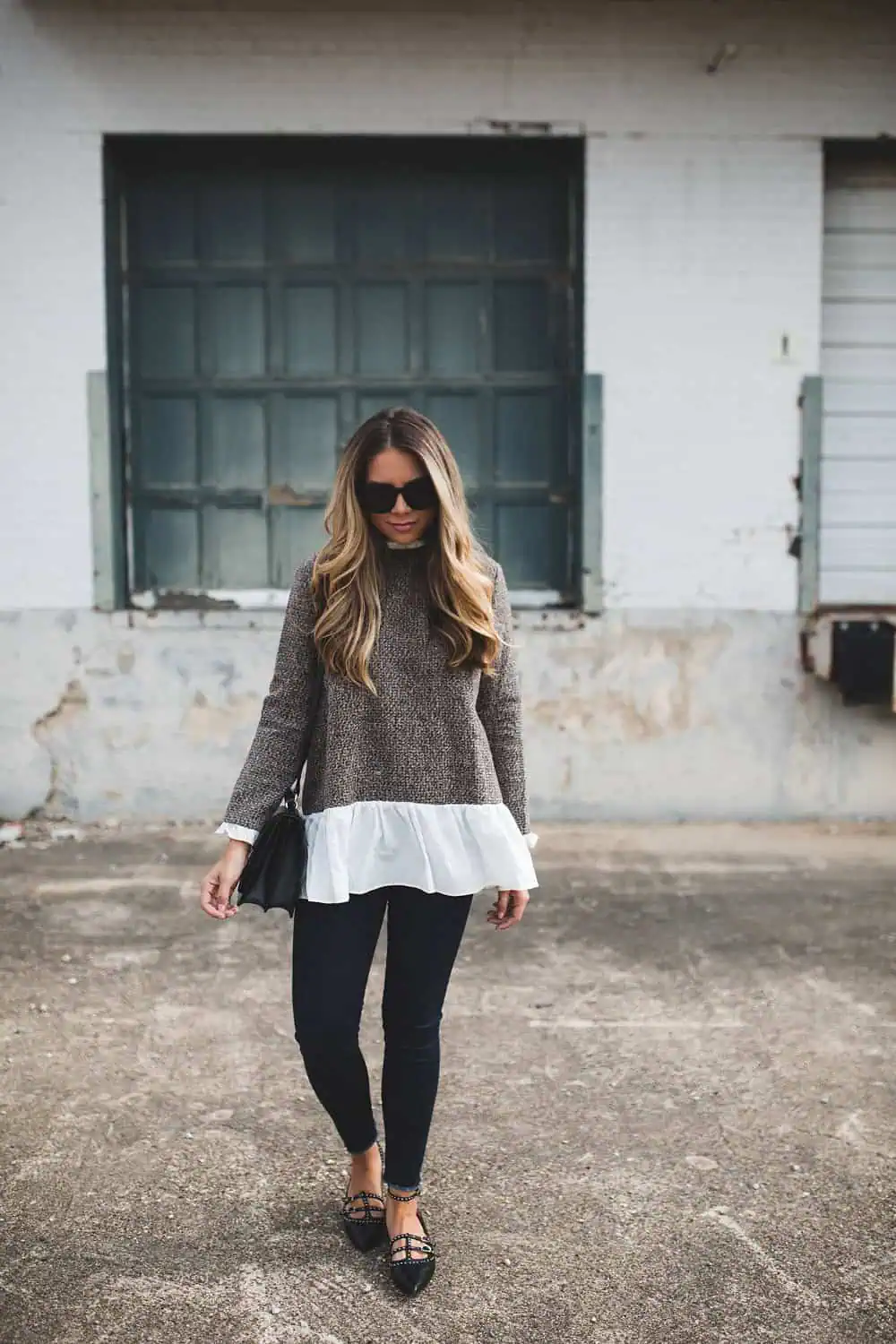 This outfit showcases a perfect blend of comfort and style for the classroom. The gray knit sweater with a white ruffled hem creates a layered look that s both cozy and chic.