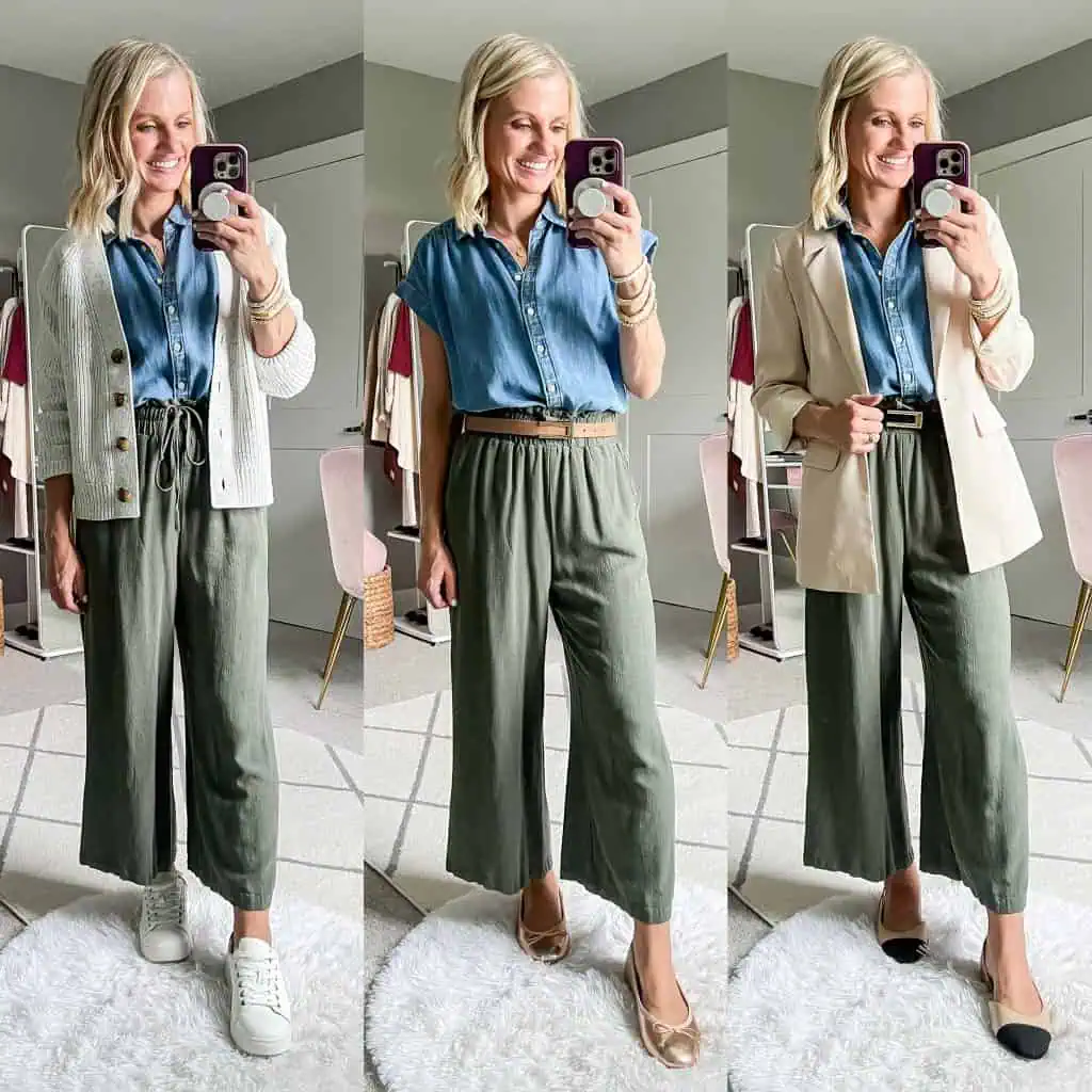 This outfit showcases the perfect blend of comfort and style for the classroom. The olive-green wide-leg pants offer a trendy yet professional look, while the chambray shirt adds a casual touch.
