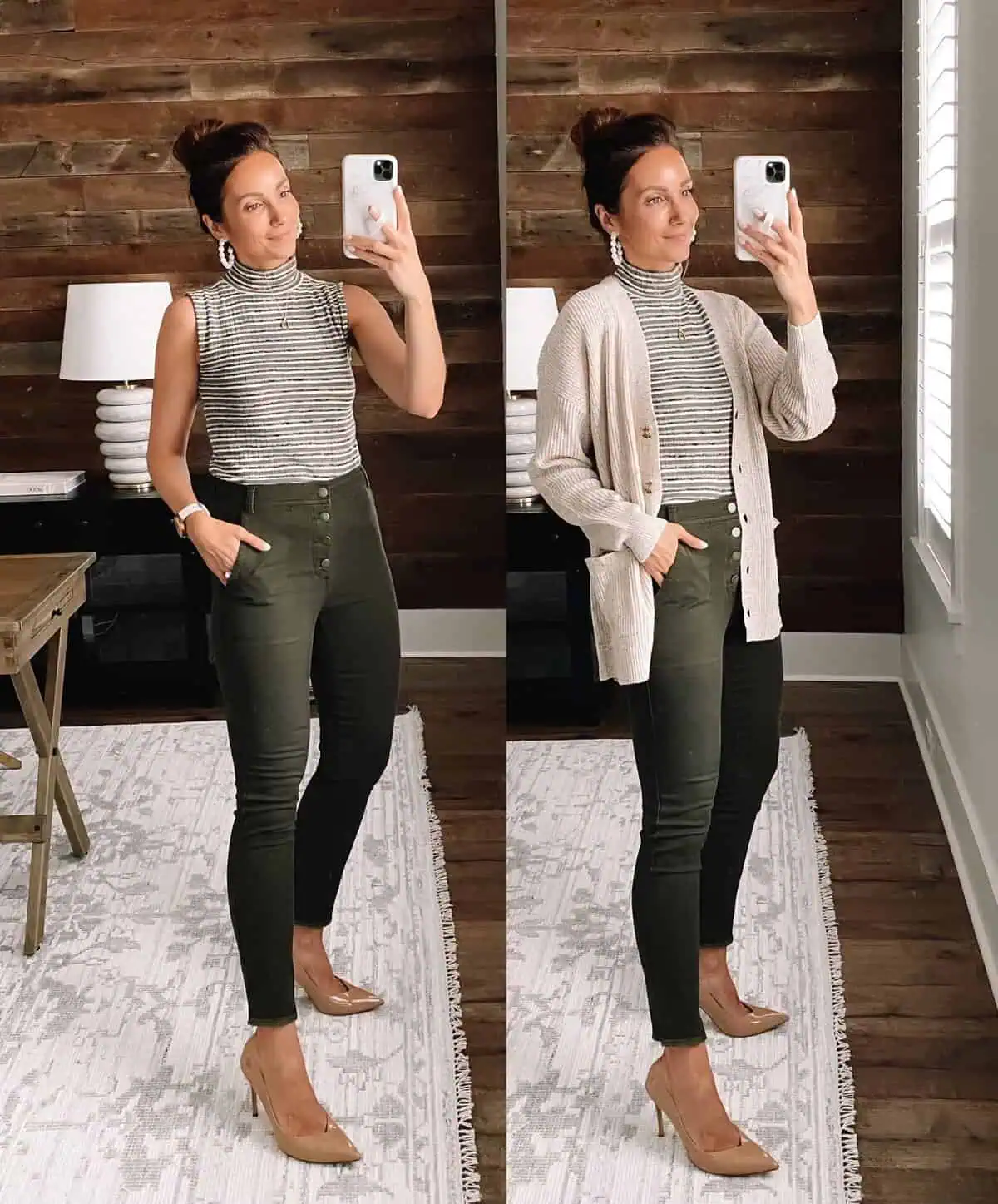 This outfit exemplifies the perfect balance of comfort and professionalism for the classroom. The striped turtleneck serves as a chic base, while the olive green pants add a touch of fall-inspired color.