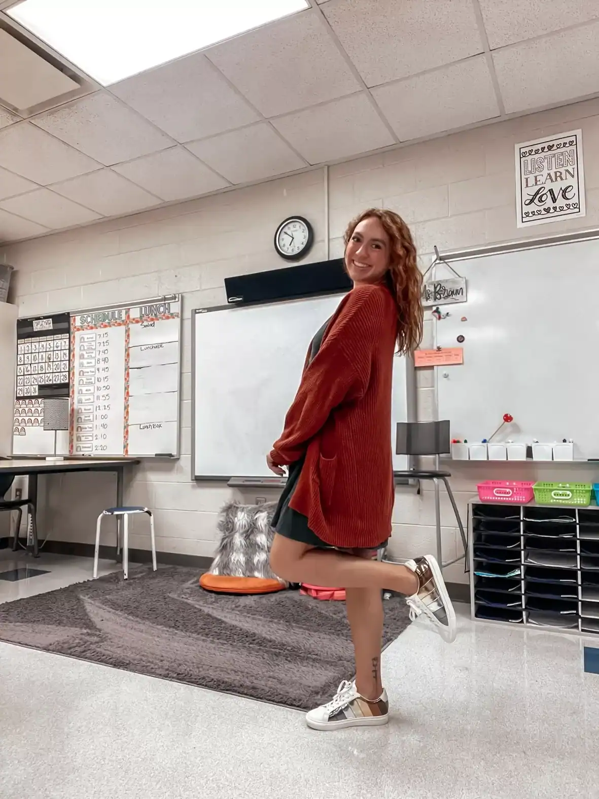 This ensemble perfectly balances comfort and style for the bustling classroom environment. The oversized rust-colored cardigan adds a cozy layer that s perfect for fall, while still allowing freedom of movement.