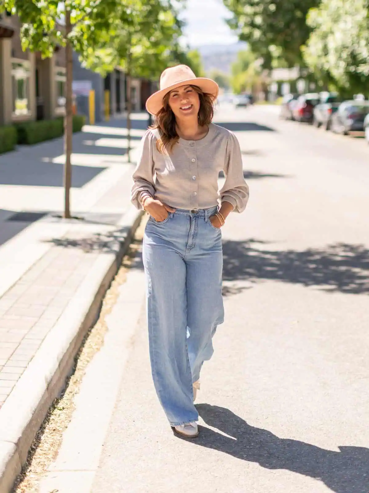 The cardigan s soft hue and button-front detail add a touch of sophistication, while the roomy denim allows for easy movement throughout the day. To elevate the ensemble, a blush-toned wide-brim hat not only adds a fashionable flair but also provides sun protection during outdoor activities.