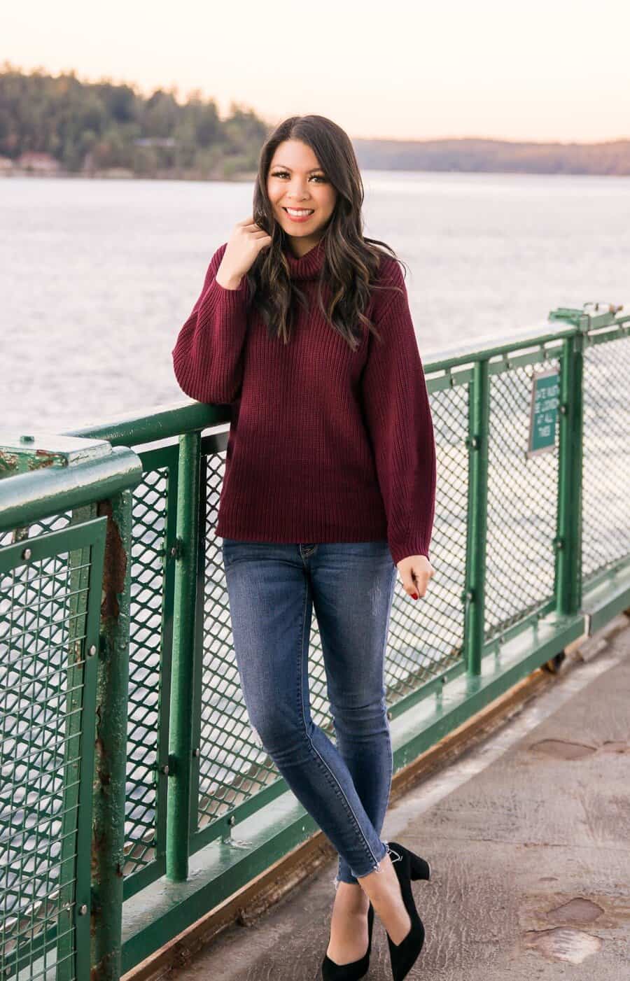 Embrace the essence of fall with this chic and cozy ensemble that’s perfect for a night out at the bar. The rich burgundy turtleneck sweater exudes warmth and sophistication, while its oversized fit adds a touch of casual comfort. Paired with sleek skinny jeans, this outfit strikes the ideal balance between relaxed and polished. The dark wash denim complements the deep hue of the sweater, creating a cohesive look that’s both stylish and season-appropriate. Elevate the outfit with classic black pumps, adding a dash of elegance to this otherwise laid-back combination. This versatile look is sure to turn heads while keeping you comfortably chic during those crisp autumn evenings.