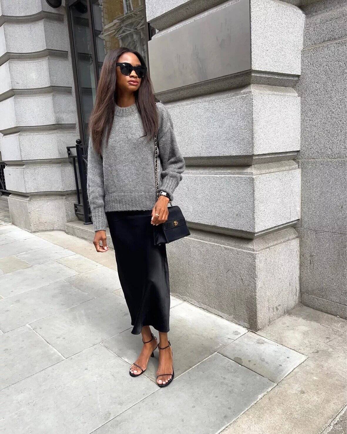 This outfit perfectly embodies the cozy-chic fall bar aesthetic with its balanced blend of comfort and sophistication. The oversized gray knit sweater offers warmth and texture, ideal for crisp autumn evenings. Paired with a flowing black silk midi skirt, the look achieves an effortless elegance that’s perfect for upscale cocktail venues. Strappy black sandals add a touch of glamour, while the small black handbag with chain details completes the ensemble with understated luxury. Oversized sunglasses lend an air of mystery, making this outfit a head-turner for any fall bar scene. The neutral color palette ensures versatility, allowing for easy accessorizing to suit various bar atmospheres.